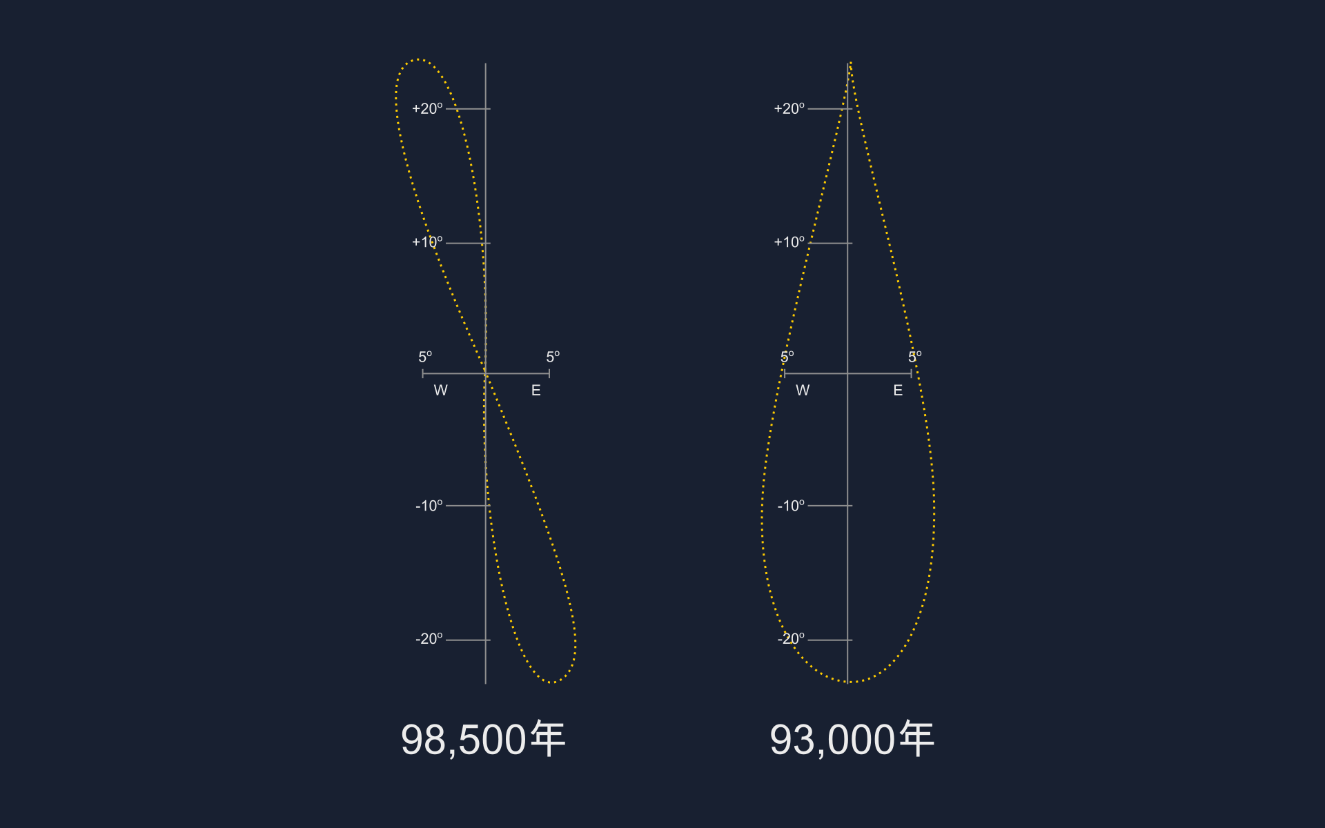 長期的には、近日点の離心率も経度も大きく変化します。例えば、約10万年前の地球の軌道は現在よりもずっと楕円で、離心率は約0.0473でした。紀元前98,500年頃、近日点が9月の分点と重なり、アナレンマがわずかに傾きました。紀元前93,000年頃、近日点は12月夏至と一致しました。このことと、より大きな離心率のために、アナレンマは雫のように見えました!