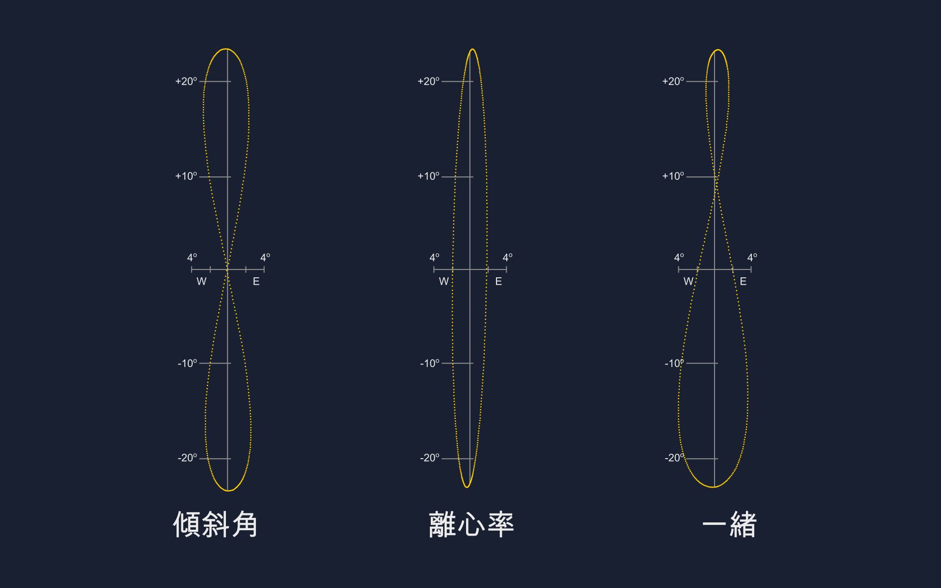 アナレンマの基本的な8の字の形は、主に地軸の傾きに由来しています。傾きのために、太陽から見ると、地球は太陽の周りを公転している間にぐらつくように見えます。そして、このぐらつきのために、地球の固定された位置から見ると、太陽は地球の空で8の字のパターンを作っているように見えます。軸の傾きがなければ、アナレンマは楕円形になります。赤道では、西から東への直線となります。