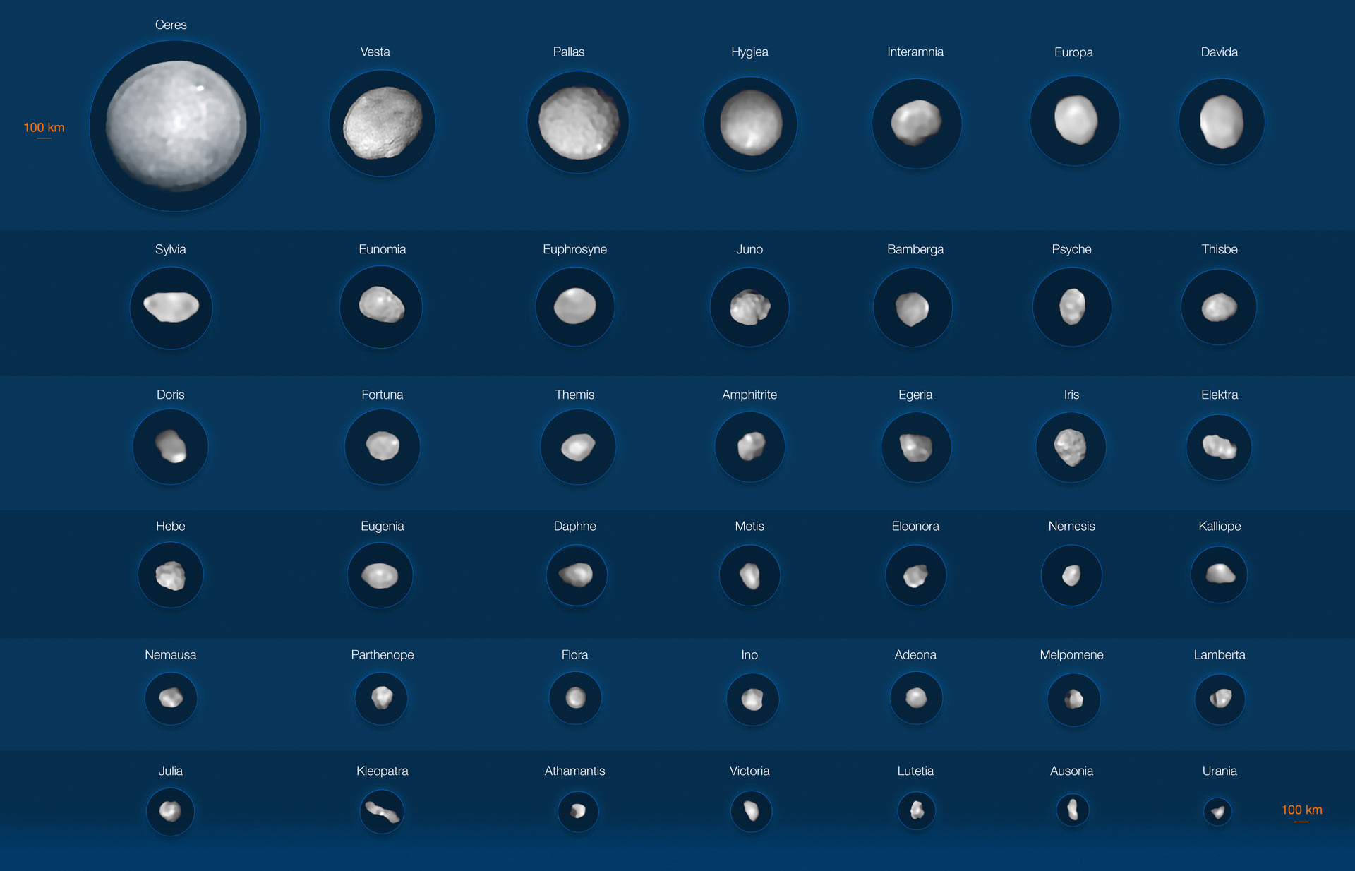 天文学者は、小惑星帯には直径1kmを超える小惑星が約100万〜200万個あり、そのほかにさらに何百万もの小天体が存在すると見積もっています。小惑星帯の中で直径が200kmを超える天体は、わずか約30個しかありません。