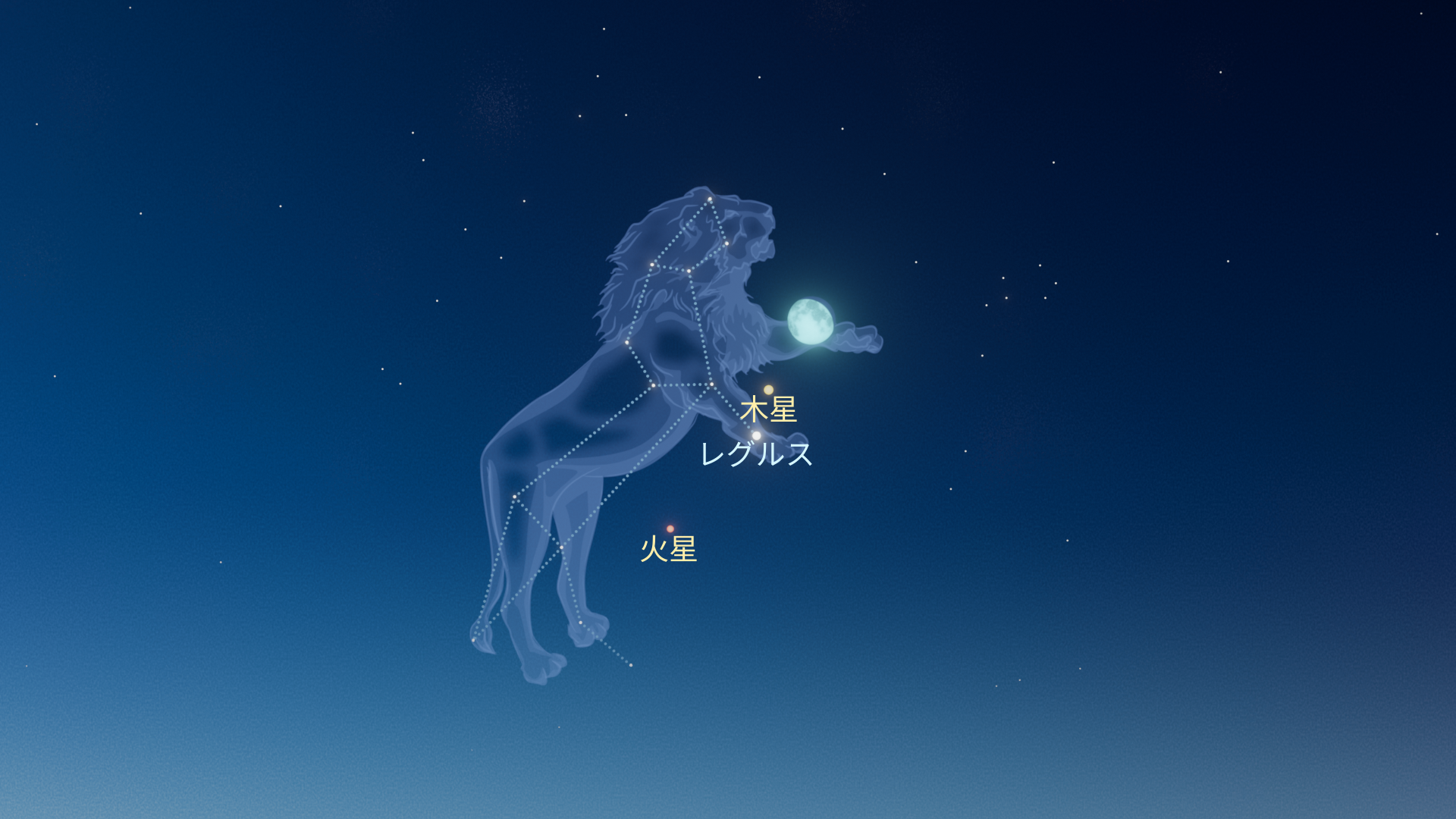 12月26日〜27日と12月27日〜28日の夜、ほぼ満月の月がしし座で木星、火星、そして明るい恒星レグルスと並び、空に目立つ弧を描くように見えます。この並びは両半球から見えますが、北半球のほうが観測しやすいでしょう。
