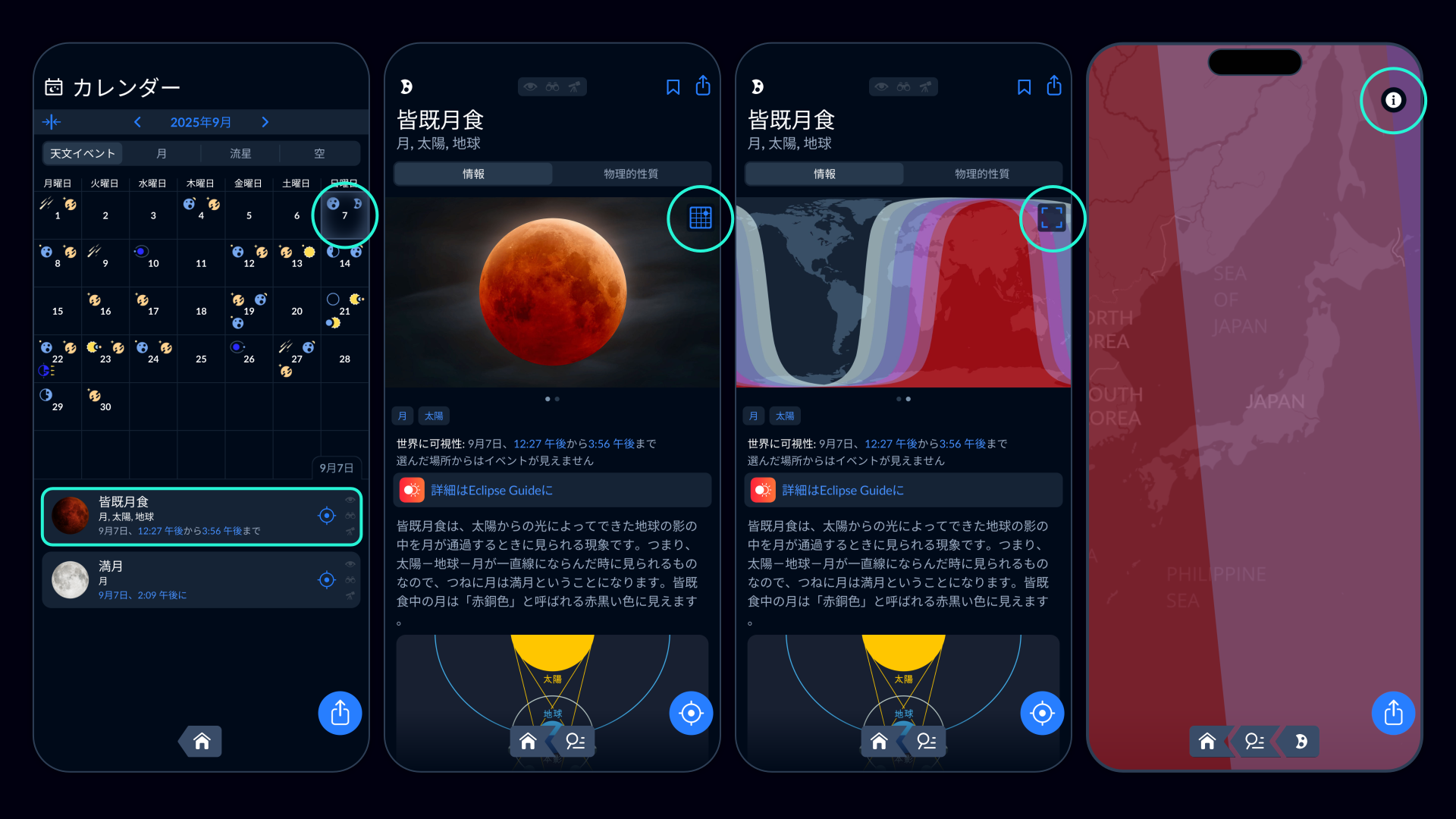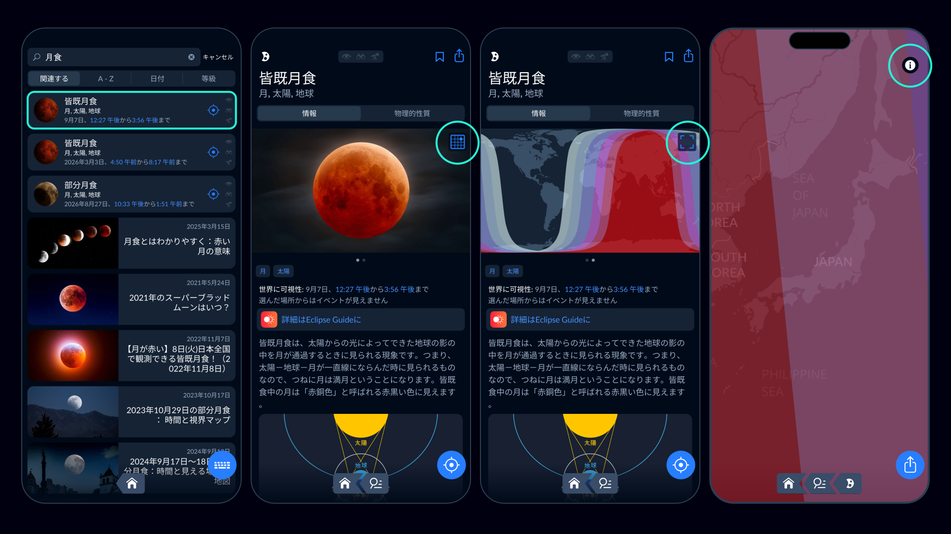 その一例がEclipse Guideアプリです。このアプリでは、月食全体の経過をインタラクティブな地図で確認でき、さらに観測地に合わせて月の向きが調整されます。