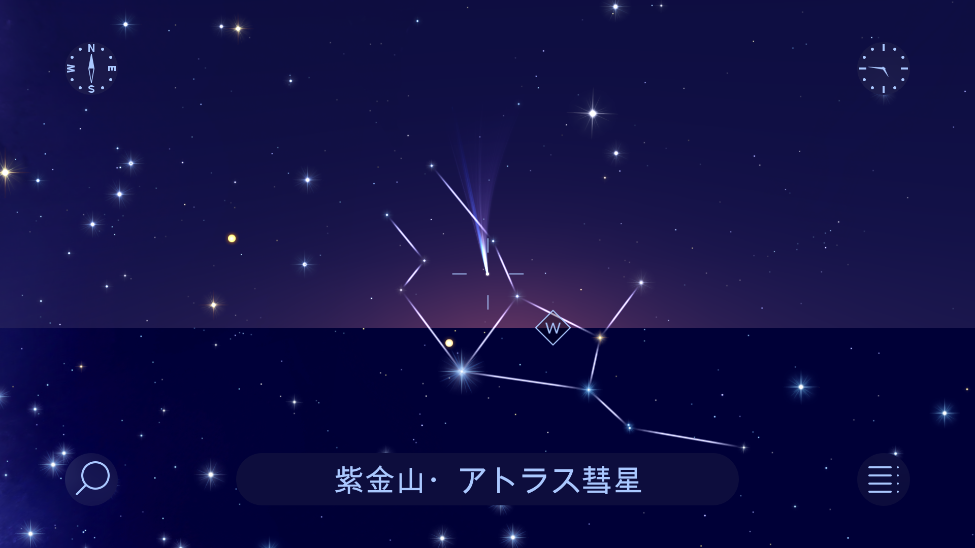 お住まいの地域で紫金山・アトラス彗星がどの方角から地平線上に昇るか確認するには、Star Walk 2 天文アプリをご利用ください。アプリは観測地点に合わせた星図を表示し、タイムマシン機能(画面右上)を使って、異なる時間帯の彗星の位置を確認できます。