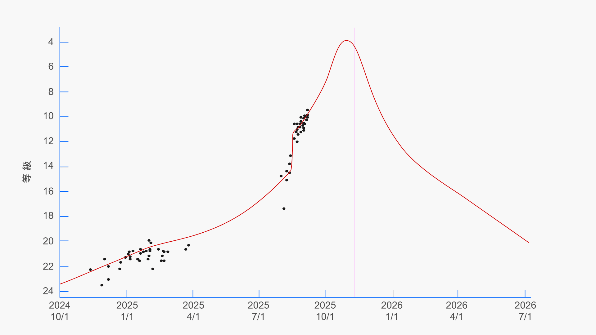 - 予想最大光度:4等級(双眼鏡で容易、条件が極めて良ければ肉眼可);近日点前後(2025年10月27日ごろ)
