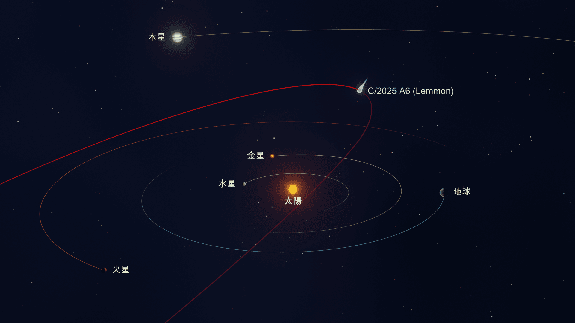 11月8日、C/2025 A6(レモン)は太陽に最接近し、その後は太陽系の外へ向かう旅を始めています。まさに一生に一度の出来事でした——レモン彗星が次に戻ってくるのは約1,000年後で、私たちの生きているあいだに再び見ることはできません。観察に最も適していたのは北半球という点も珍しい特徴です。C/2025 A6 の軌道傾斜角は 143.7°で、惑星の通常の進行方向とは逆行して北側で近日点に近づいたため、北半球の観測者に有利でした。