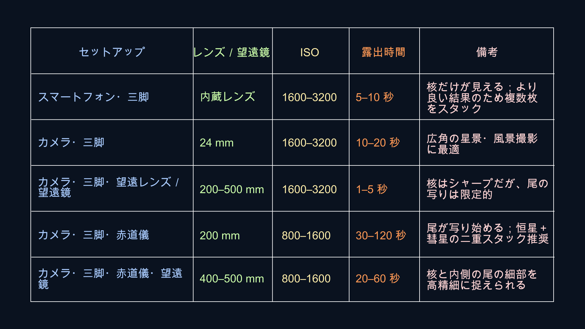 - レンズ: 風景には 14–35mm、彗星を大きく撮るなら85–135mm