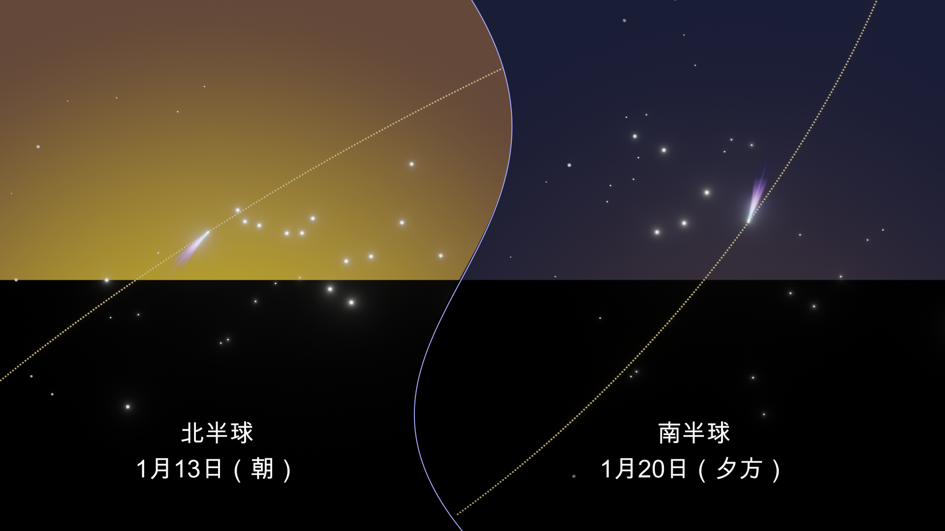 ATLAS彗星は北半球の空から完全に姿を消し、現在は南半球の夕方の空で見ることができます。1月13日の近日点通過時よりも暗くなっていますが、太陽から遠ざかり、暗い空に移動したため、観測条件はむしろ改善されています。このため、双眼鏡での観測や、彗星の思い出深い写真を撮りたい方にとっては絶好のターゲットとなっています!