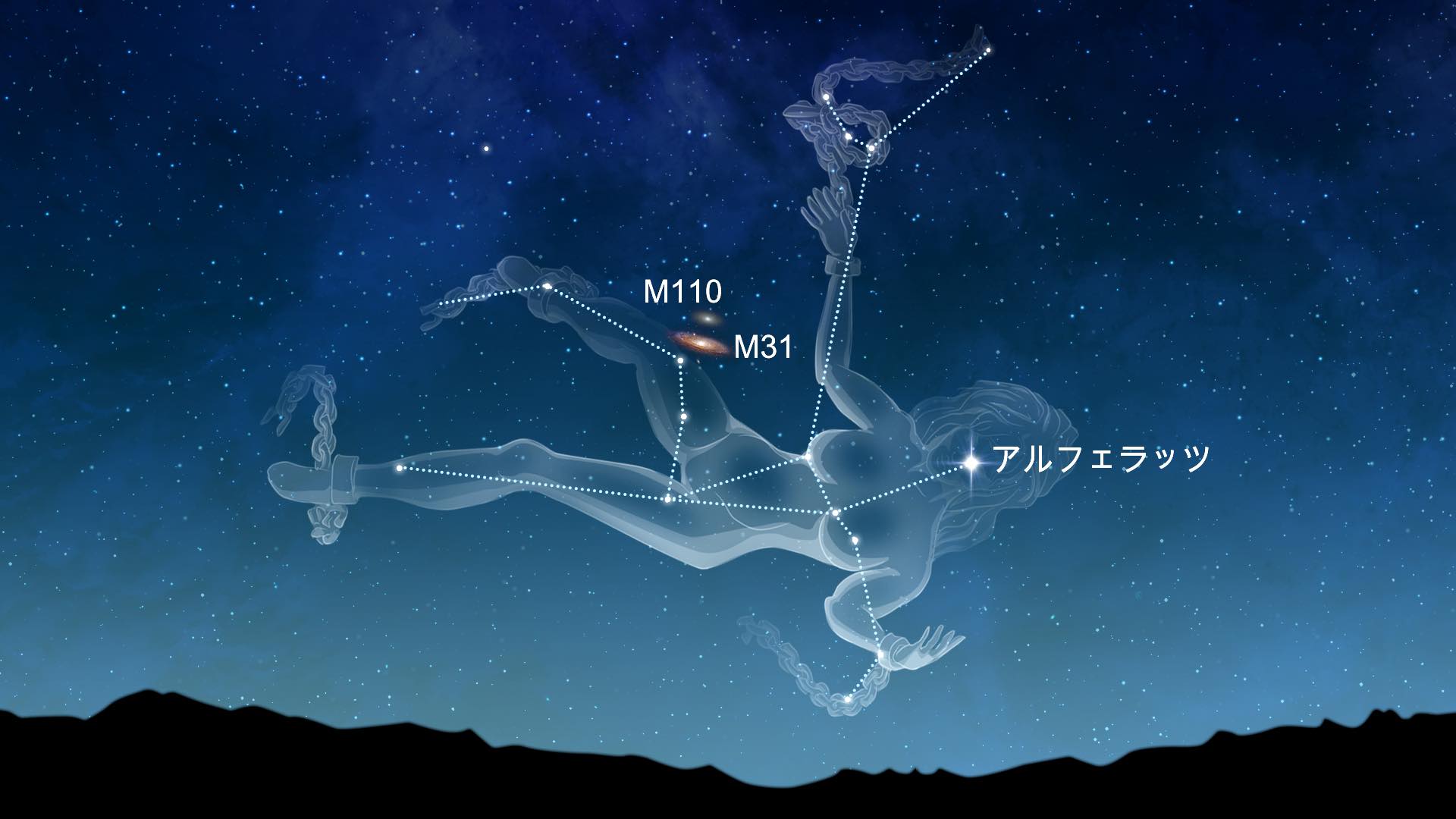 アンドロメダは、カシオペア座とペガスス座の間に位置しています。最も明るい星であるアルフェラッツは、ペガスス座の大部分を占める大四辺形アステリズムの左上隅に位置しています。また、アンドロメダにはアンドロメダ銀河(M31)があり、暗いところで肉眼で見ることができ、私たちの天の川銀河に最も近い銀河として知られています。望遠鏡を使えば、この星座の中にある他の銀河は、M32、M110、NGC 404、NGC 891です。