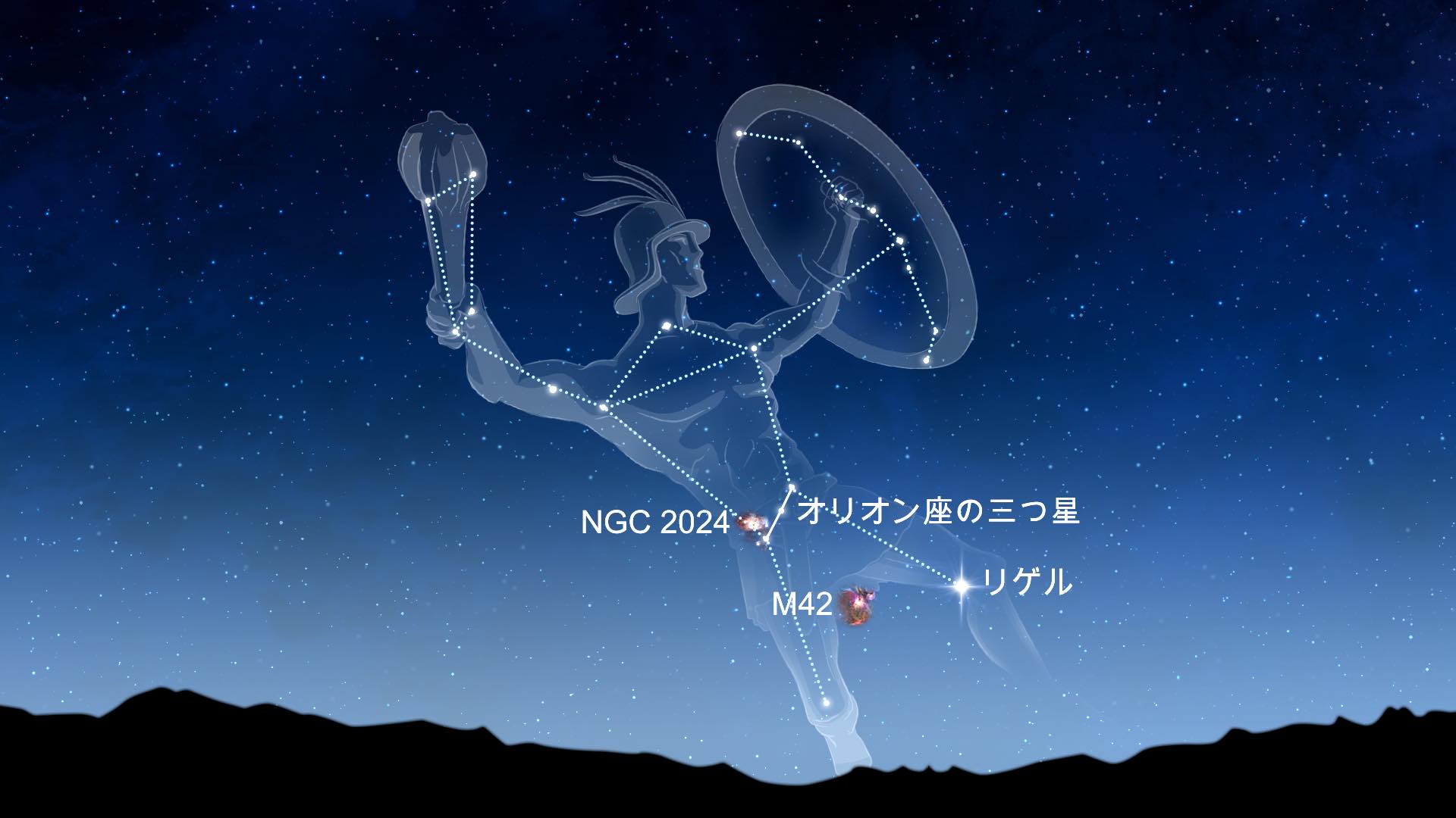 の星(アルニタク、アルニラム、ミンタカ)のほか、肉眼ではリゲル、ベテルギウス、ベラトリクス、サイフといった、オリオン座の体を示す最も明るい星を見つけることができます。また、この星座には、オリオン座分子雲という不思議な天体がたくさんあります。オリオン大星雲**(M42)は、肉眼で観察できるほど明るいです。ド・メラン星雲(M43)、反射星雲M78、そして炎の星雲(NGC 2024)は、望遠鏡で観察することができます。