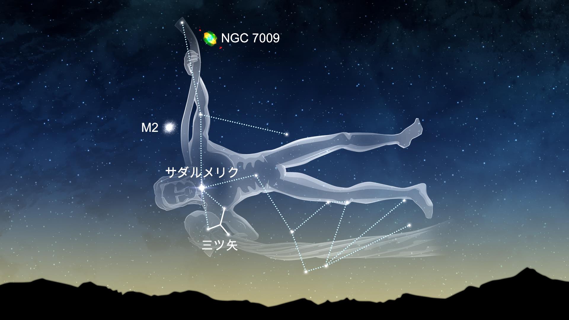 みずがめ座にはあまり明るい星がありません。最も目立つのはサダルメリクとサダルスウドです。暗い空の下では、三ツ矢として知られる「Y」字型のアステリズムを見つけることができます。光学機器を使った深宇宙観察では、メシエ天体のM2・M72(球状星団)、M73(アステリズム)に加え、らせん状星雲(NGC 7293)や土星状星雲(Saturn Nebula/NGC 7009)を探してみましょう。