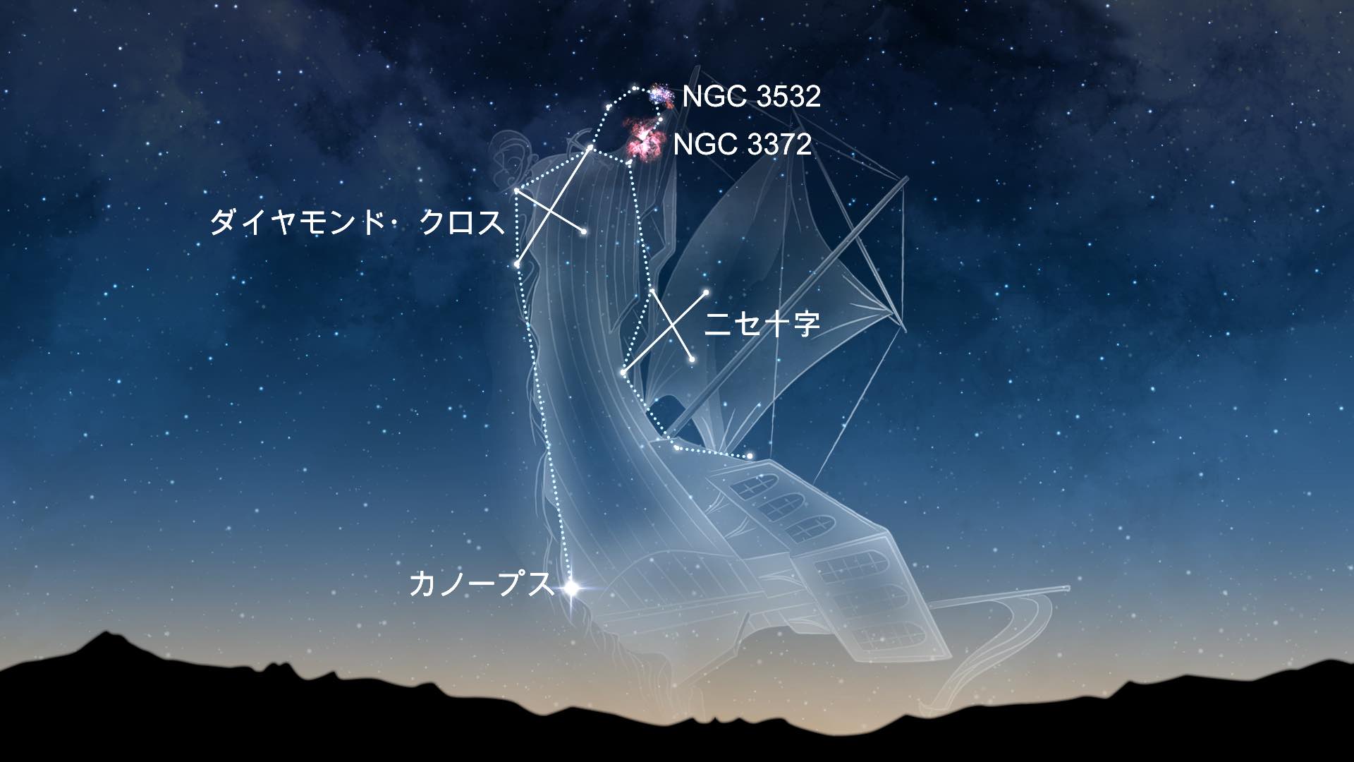 りゅうこつ座には、夜空で2番目に明るい星であるカノープスがあります。そのほかの2つの星、アヴィオールとアスピディスケは、ほ座のアルセフィナとマルケブとともに、偽十字として知られる星パターンを形成しています。もう1つの十字型星座、ダイヤモンド・クロスもりゅうこつ座にあり、ミアプラキドゥス、θ星、υ星、ω星によって形成されています。どちらもしばしばりゅうこつ座と混同されます。Sky Tonightでは、星座の名前と位置を表示し、このような間違いを防ぐことができます。