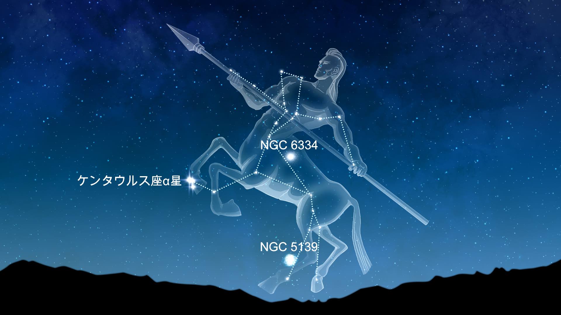 ケンタウルス座は大きな星座で、アルファ・ケンタウリを含んでいます。この恒星(厳密には3つの恒星からなる系)は、この星座で最も目立つ天体であり、夜空全体で3番目に明るい恒星です。肉眼でも簡単に見つけることができ、ケンタウルス座で最もよく知られた深空天体であるオメガ星団(NGC 5139)も観察できます。望遠鏡を使えば、青い惑星状星雲(NGC 3918)や、ケンタウルス座A、銀河NGC 4603、NGC 4622、NGC 4945も見ることができます。