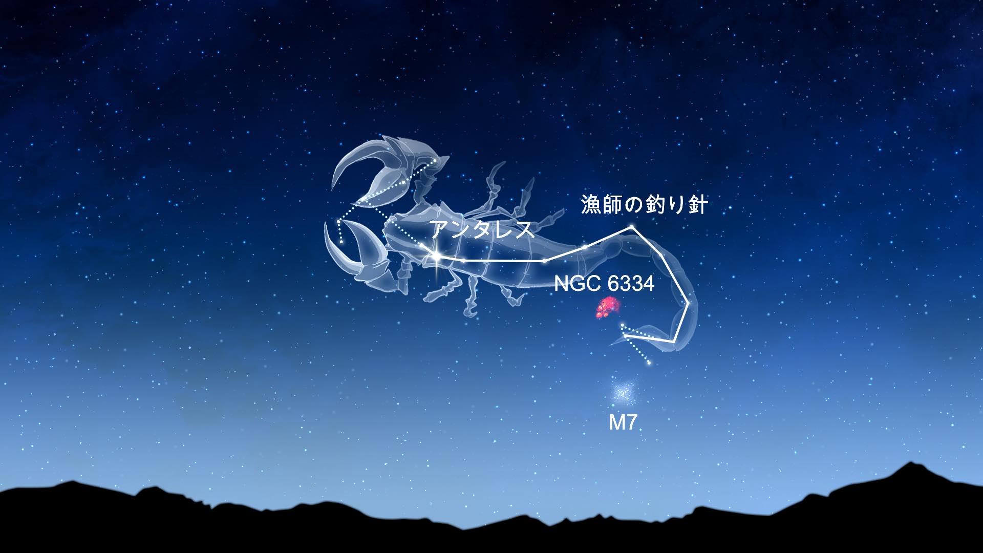 さそり座は最も南に位置する星座で、釣り針と呼ばれる鉤型の星群から容易に見分けることができます。最も明るい星はアンタレスです。この星の名前は「火星に拮抗する(星)」を意味するギリシャ語に由来し、ルビーのような赤い色と火星に匹敵する明るさを持つことが強調されています。この星座には、肉眼でも見えるプトレマイオス星団(M7)を含む4つのメシエ天体があります。他の3つ、M4、M80、そしてバタフライ星団(M6)は双眼鏡で観察します。望遠鏡では、猫の足星雲 (NGC 6334) とバタフライ星雲 (NGC 6302) がよく見えます。