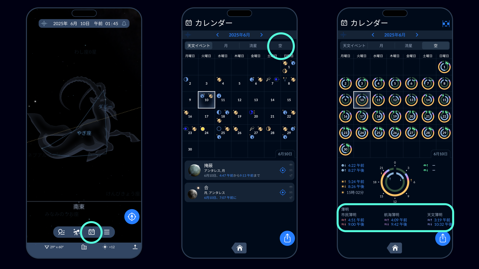 自分の場所の真っ暗間の時間を知るには、Sky Tonight アプリを使用します。アプリを開き、画面下部のカレンダーのアイコンをタップして、「空」のタブを選択します。Sky Tonight は、真っ暗間の開始時間と終了時間、およびその期間を表示します。