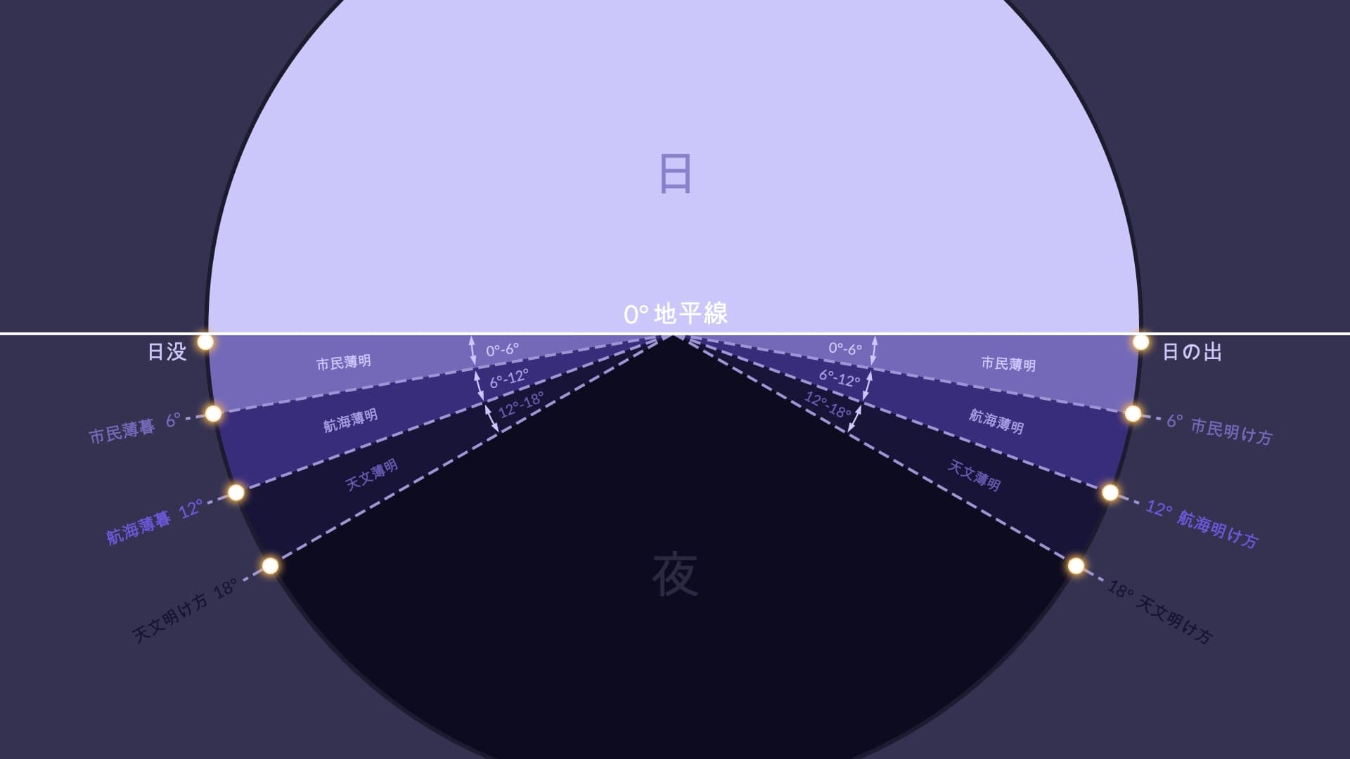 明け方(英語:dawn)と薄暮(英語:dusk)は、地平線に対する太陽の位置に基づいた特定の瞬間です。薄暮と明け方の3つの種類を区別するのが通例です。それらは、太陽の中心を地平線の下に浸すことによって決定されます。