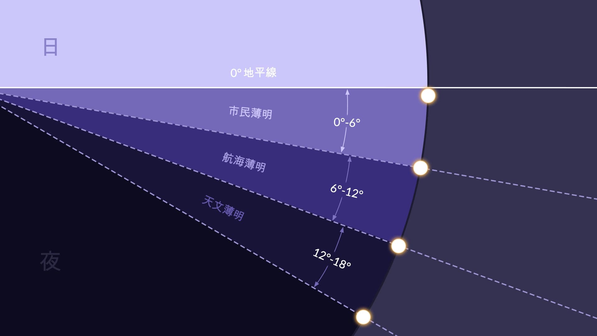 視覚的説明については、薄明、薄暮と明け方に関するインフォグラフィックを確認してください。