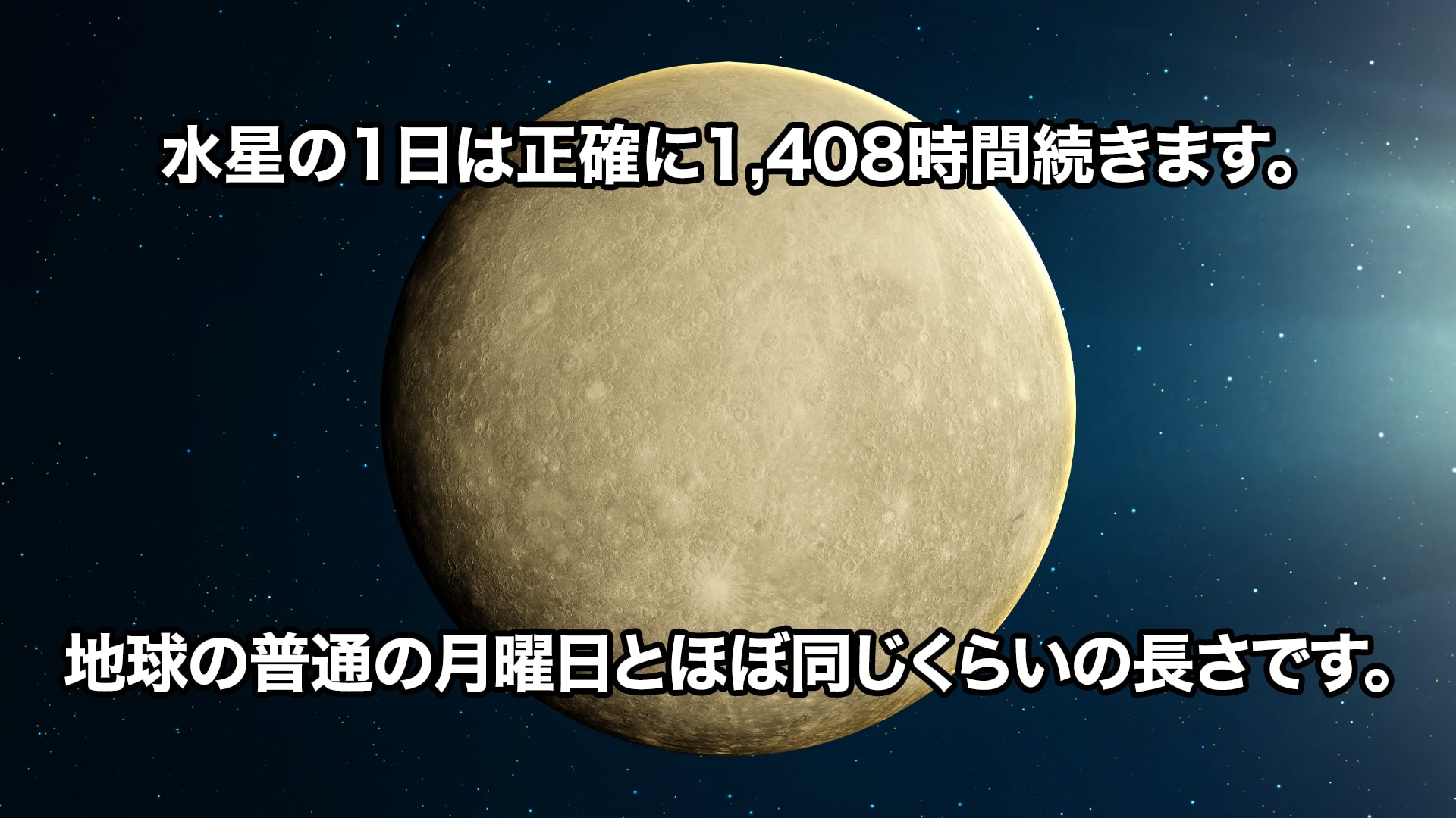 水星は約59地球日で1回自転しますが、太陽が昇ってから次に昇るまでの「太陽日」は約176地球日もかかります。水星は約88地球日で太陽を1周するので、これはほぼ水星の2年分です。つまり水星では、日没を迎える前に誕生日を2回お祝いできるかもしれません。
