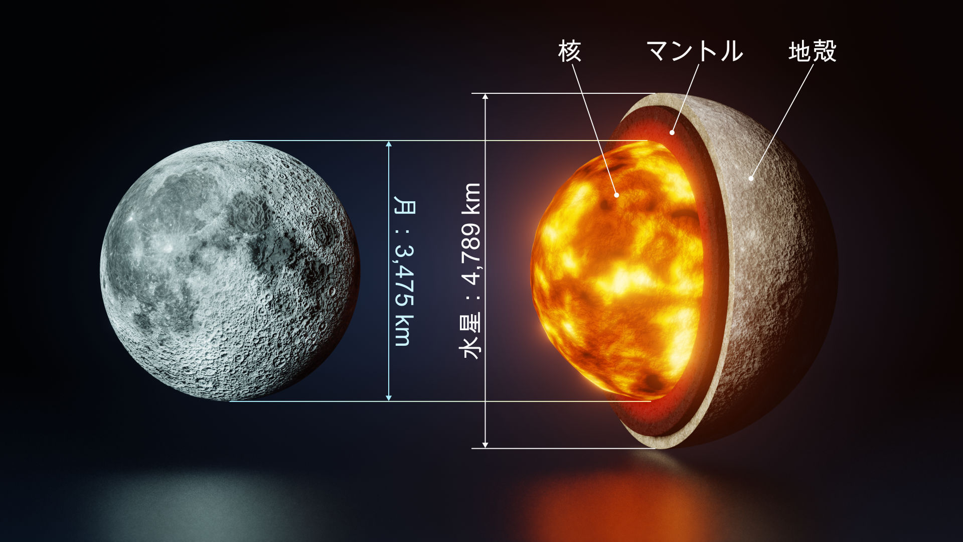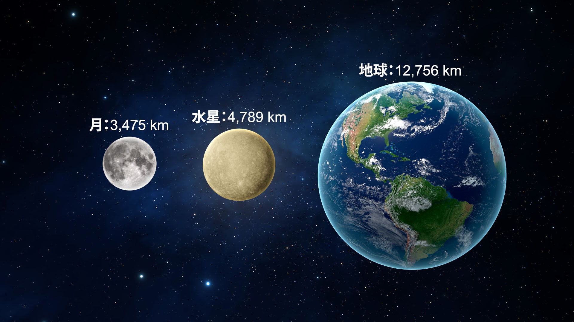 水星は、質量と直径の両方で太陽系で最小の惑星です。水星は地球の18分の1の大きさで、直径で地球の5分の2くらです。水星のサイズをよりよく理解するために、月より3分の1くらいだけ大きいとしましょう。
