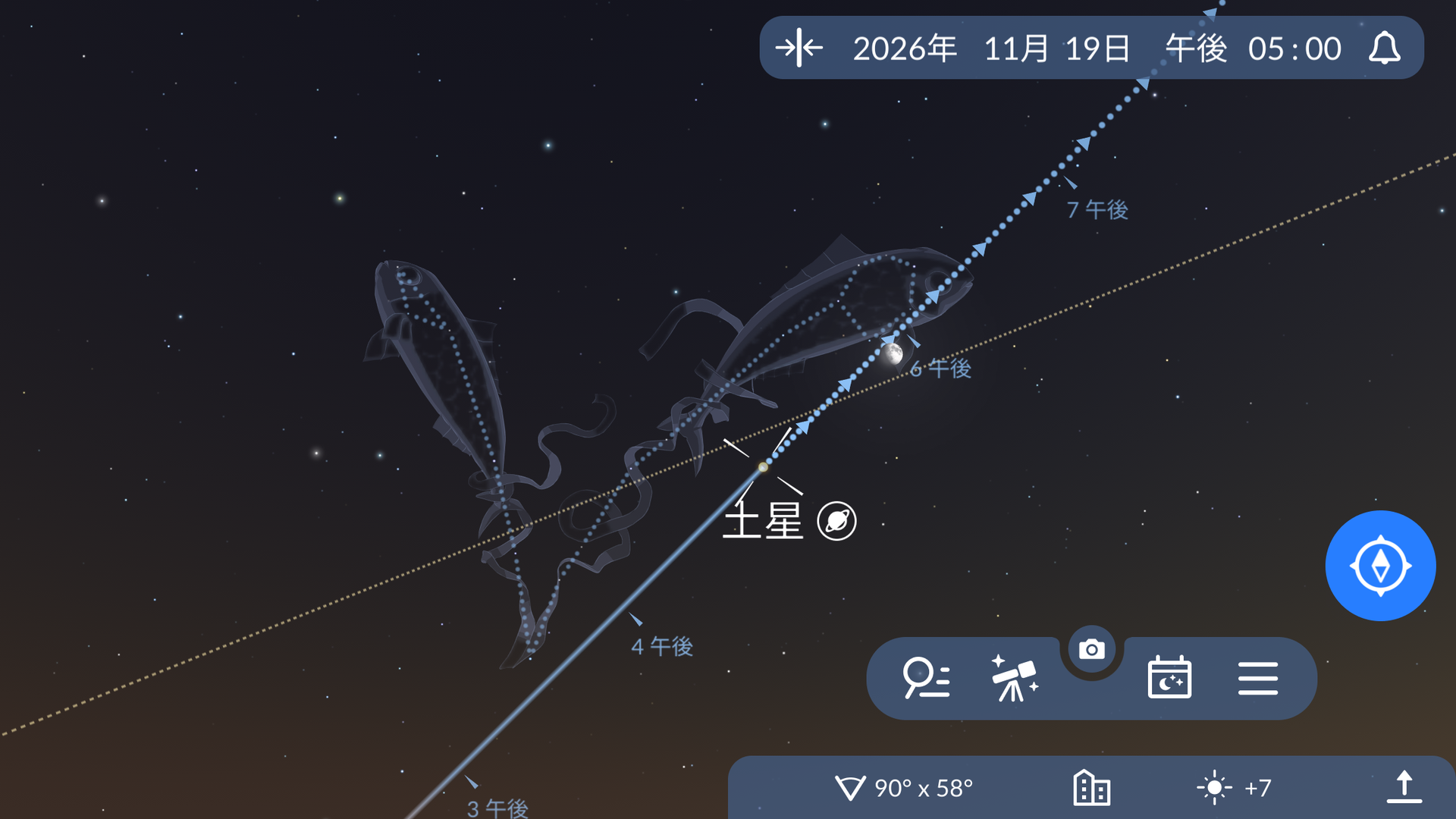 - 画面右下のターゲットボタンをタップします。空のマップ上に惑星の位置が表示されます。