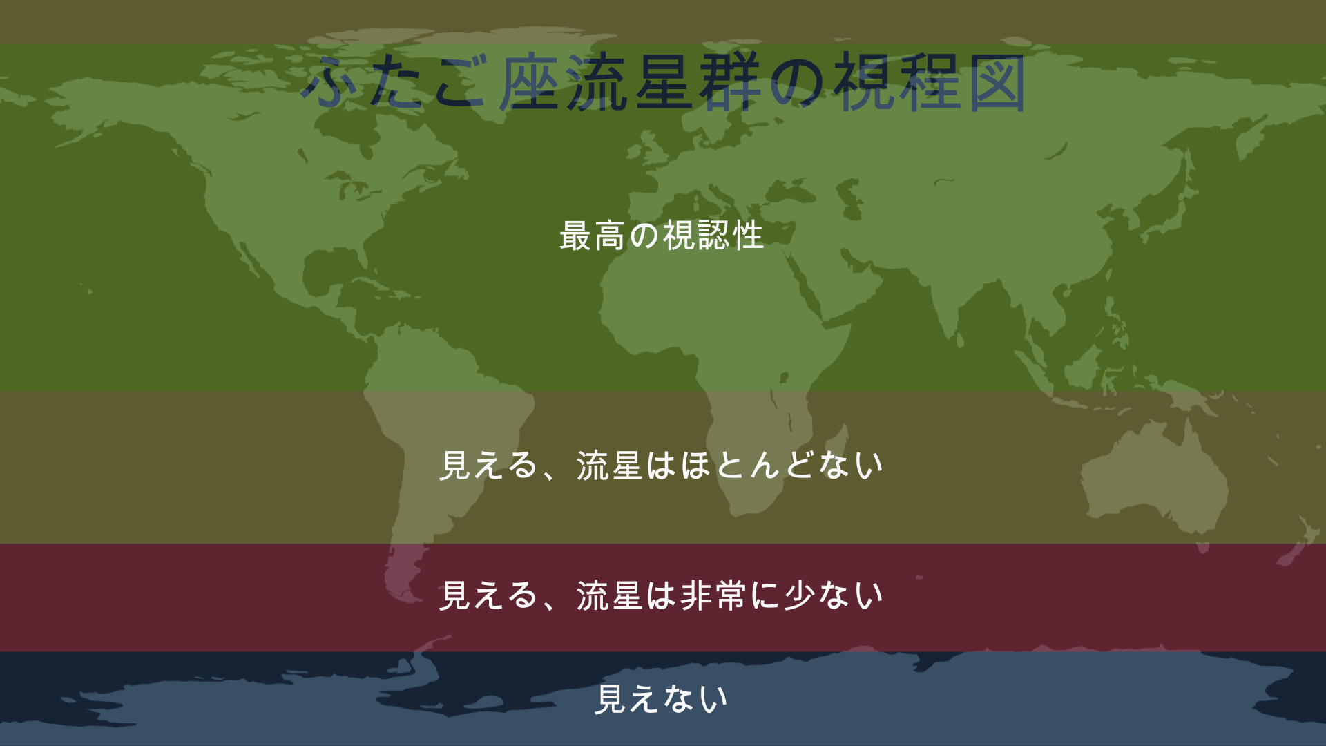 暗く澄んだ空の状態では、地球上のどこにいてもふたご座流星群が見えますが、北半球からの観測者の方がよく見えます。南半球から見ている人達は、放射点がそれほど高くないため、ふたご座流星群を目撃することが少なくなります。