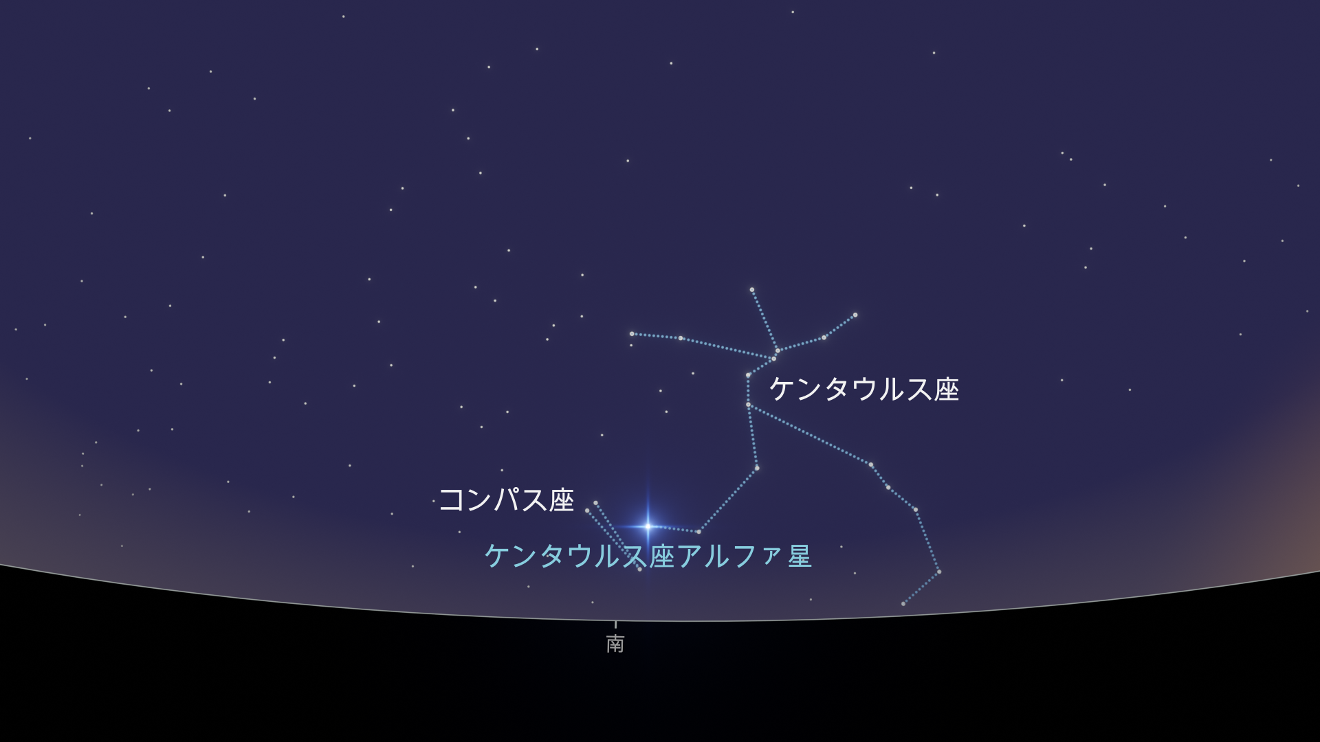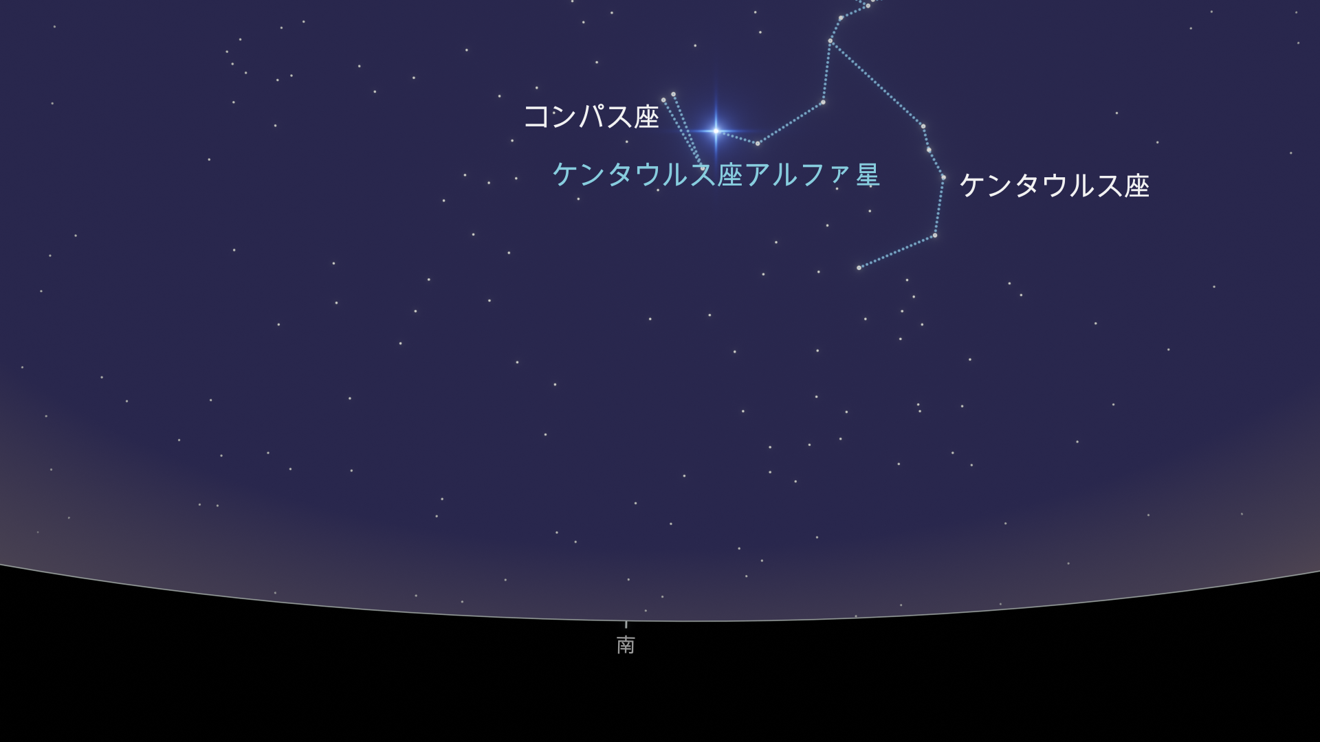 南半球では、南の地平線よりさらに高い位置でケンタウルス座α星を見つけ、東側に目を移すと、細長い三角形を描く星の並びがコンパス座です。