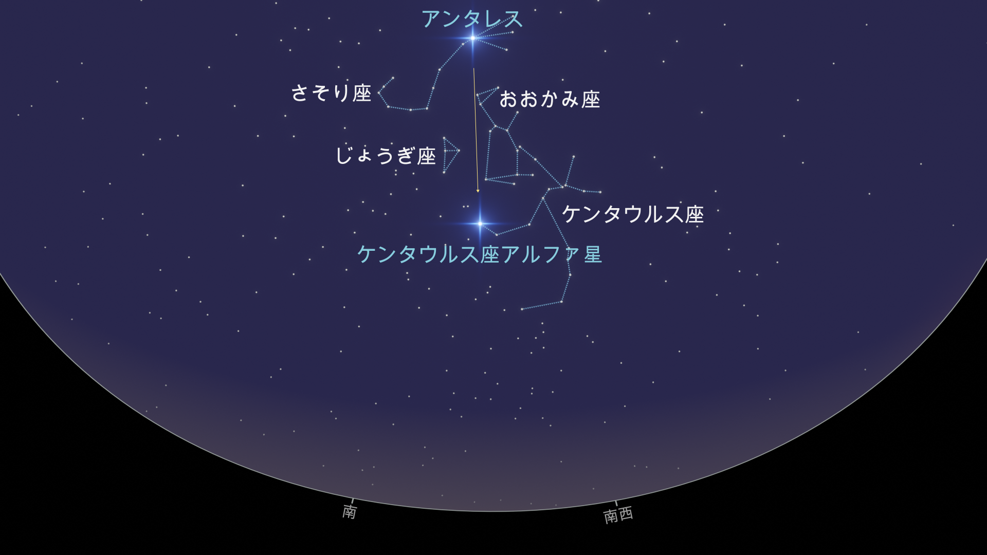 - 次にケンタウルス座を探します。アンタレスから南西方向へ想像上の直線を引くと、そこにケンタウルス座α星(等級-0.3)が見つかります。