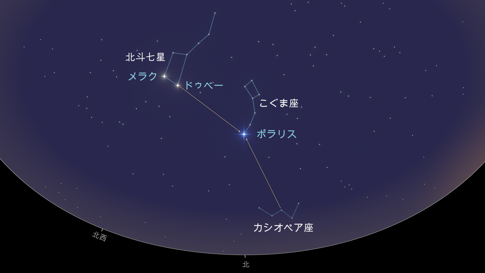 または、W字形のカシオペヤ座の真ん中の星から南西方向へ線を引くと、その先にポラリスが見つかります。