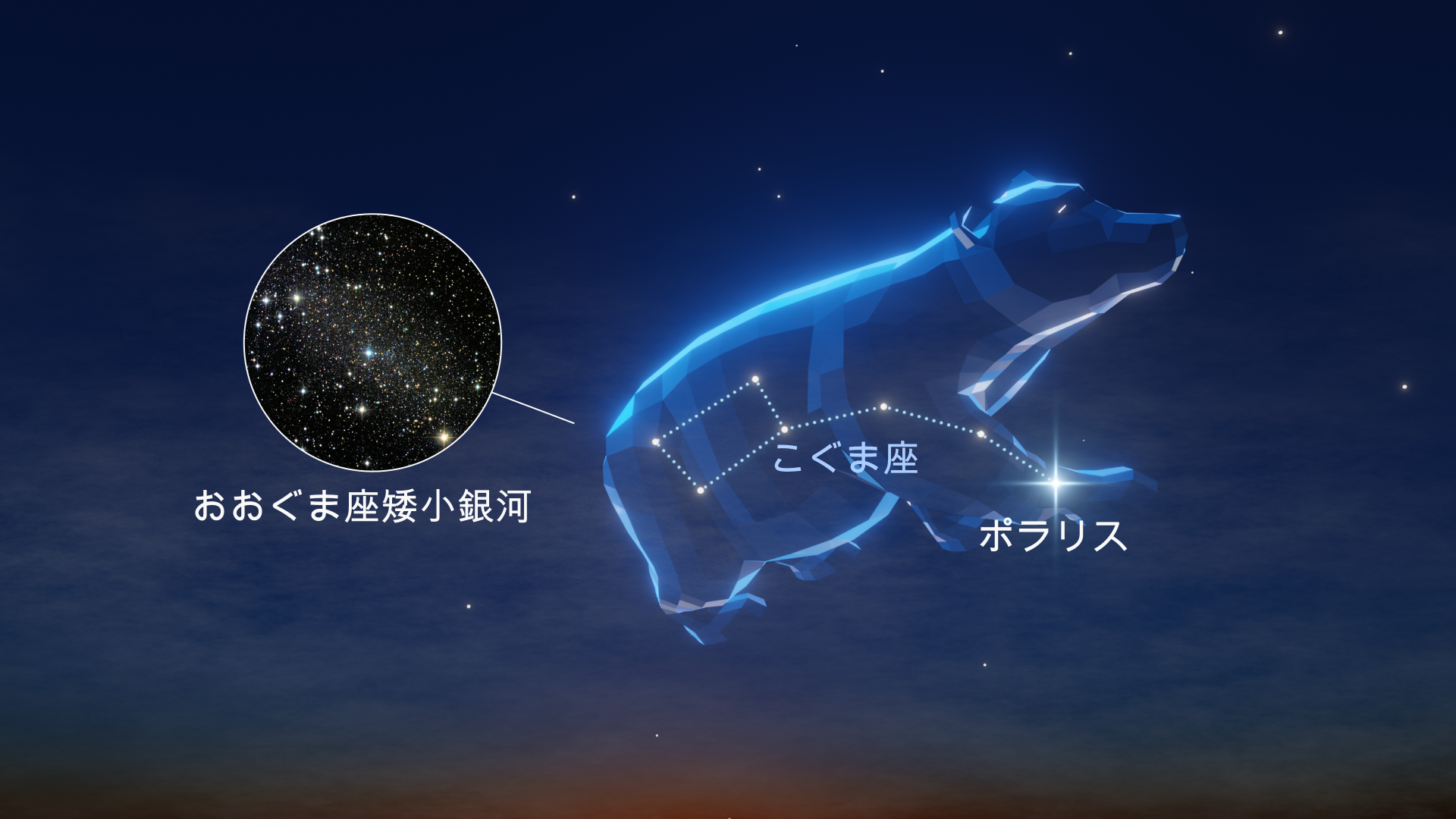 北半球では、こぐま座は周極星座で、一晩中、昼も夜も沈まない星座です。6月は特に観察に適しています。こぐま座の代表星は北極星とも呼ばれるポラリス(等級2.0)で、地球が自転してもほぼ同じ位置に留まります。
