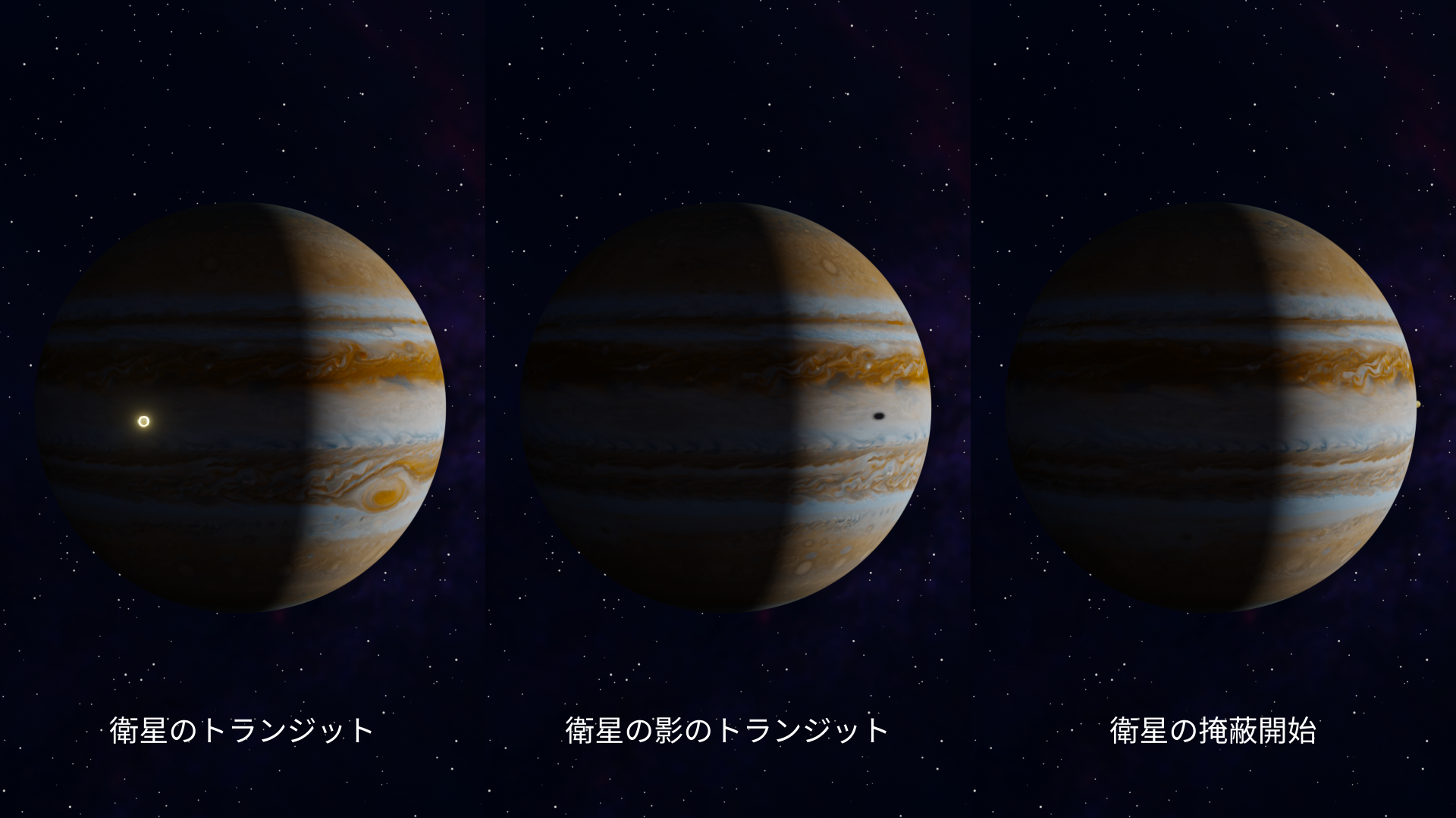 - 掩蔽(えんぺい):衛星が木星の背後に回り込み、しばらく見えなくなる現象。