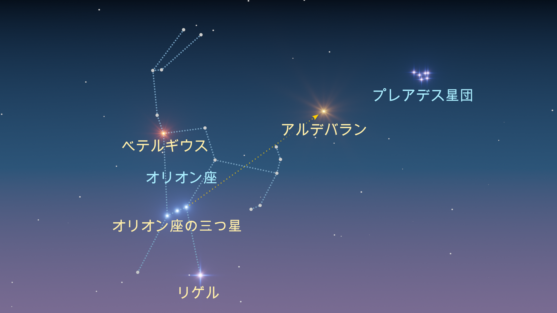 その三つ星を結ぶ線をオリオンの弓の方向へ延長します。