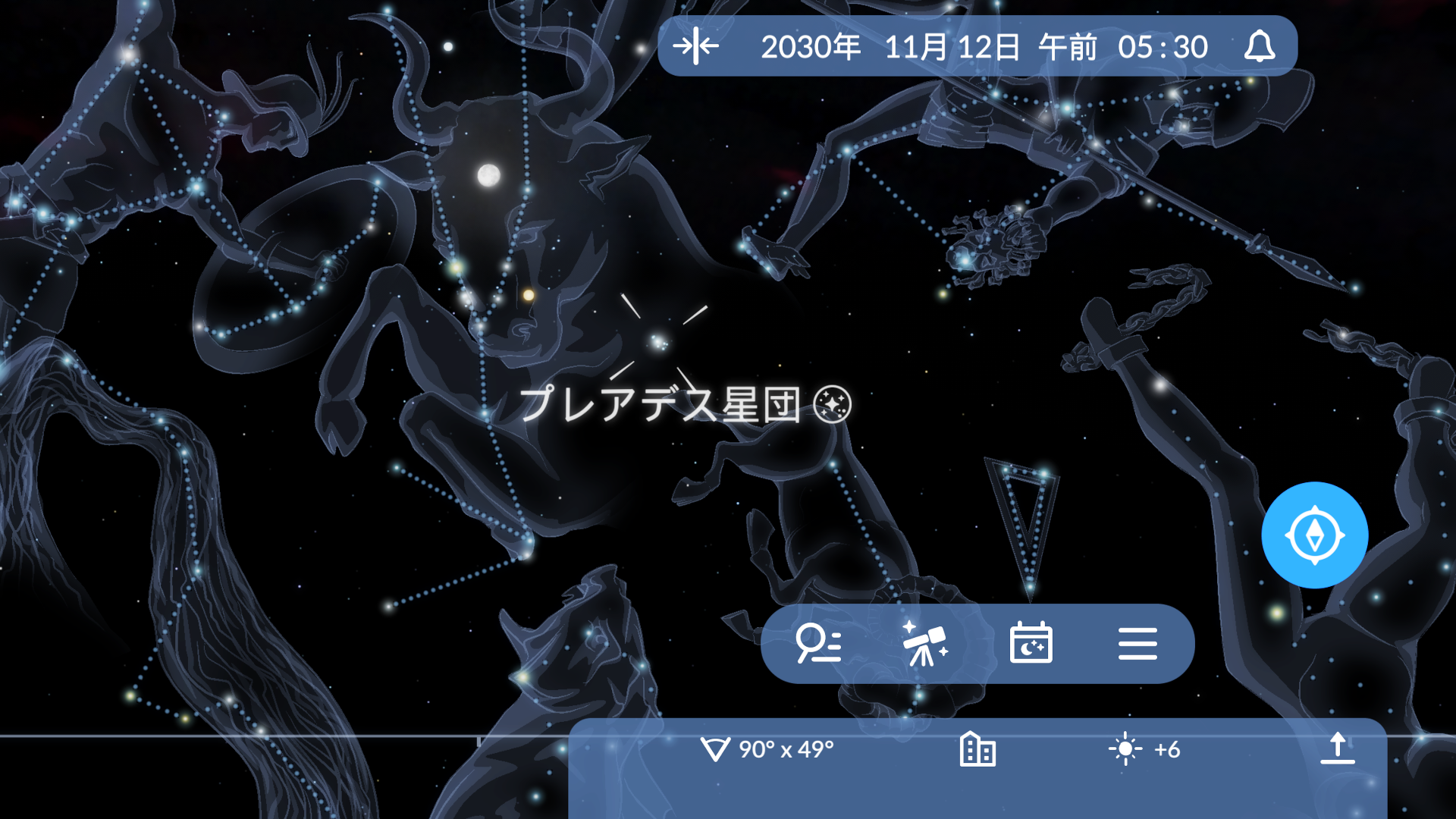 プレアデスは散開星団であり、最も明るい深宇宙天体の一つです。暗い空の下では肉眼でも見ることができ、多くの観測者は6つの星を確認でき、それは小さな北斗七星のように見えます。光学機器を使用すると、より多くの星が見え、星団を包み込むような星雲のような輝きも確認できます。プレアデスは明るく観測しやすいため、アマチュアの深宇宙観測に最適な対象です。Sky Tonightアプリを使えば、数回のタップでプレアデスの位置を簡単に見つけることができます。