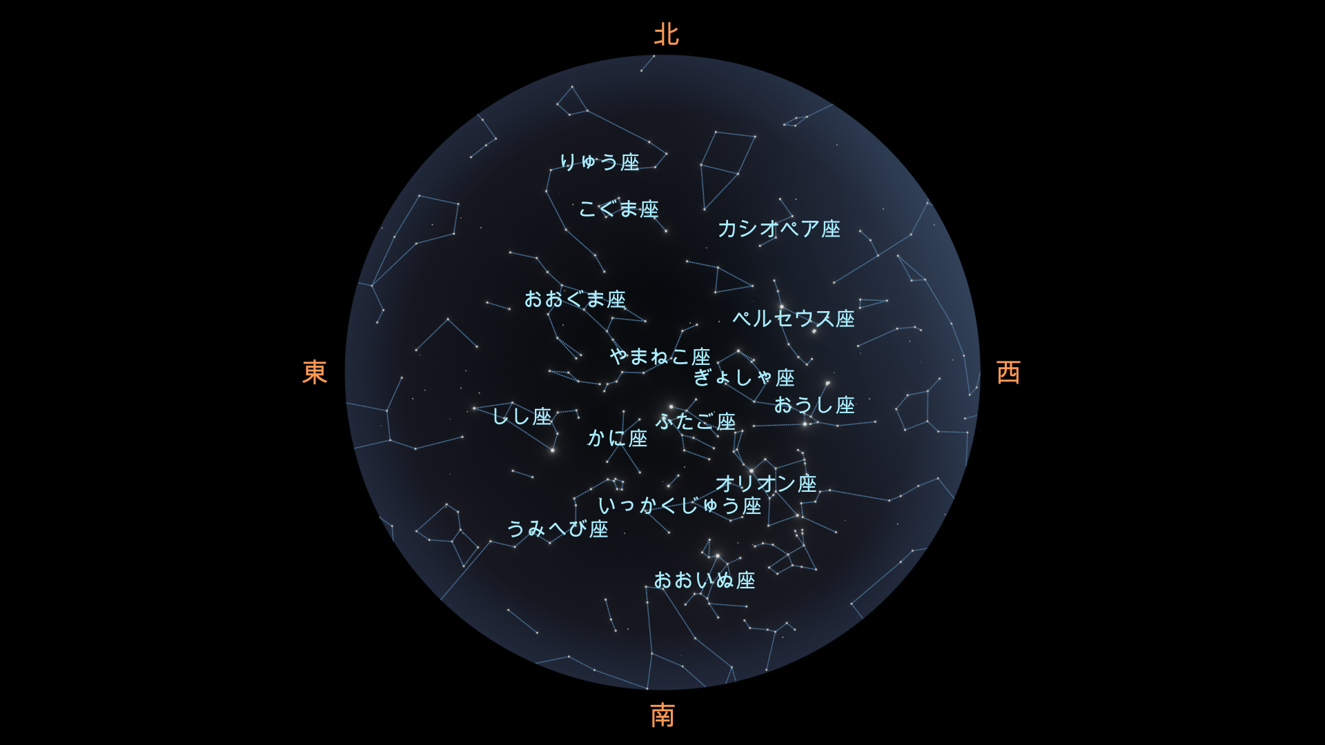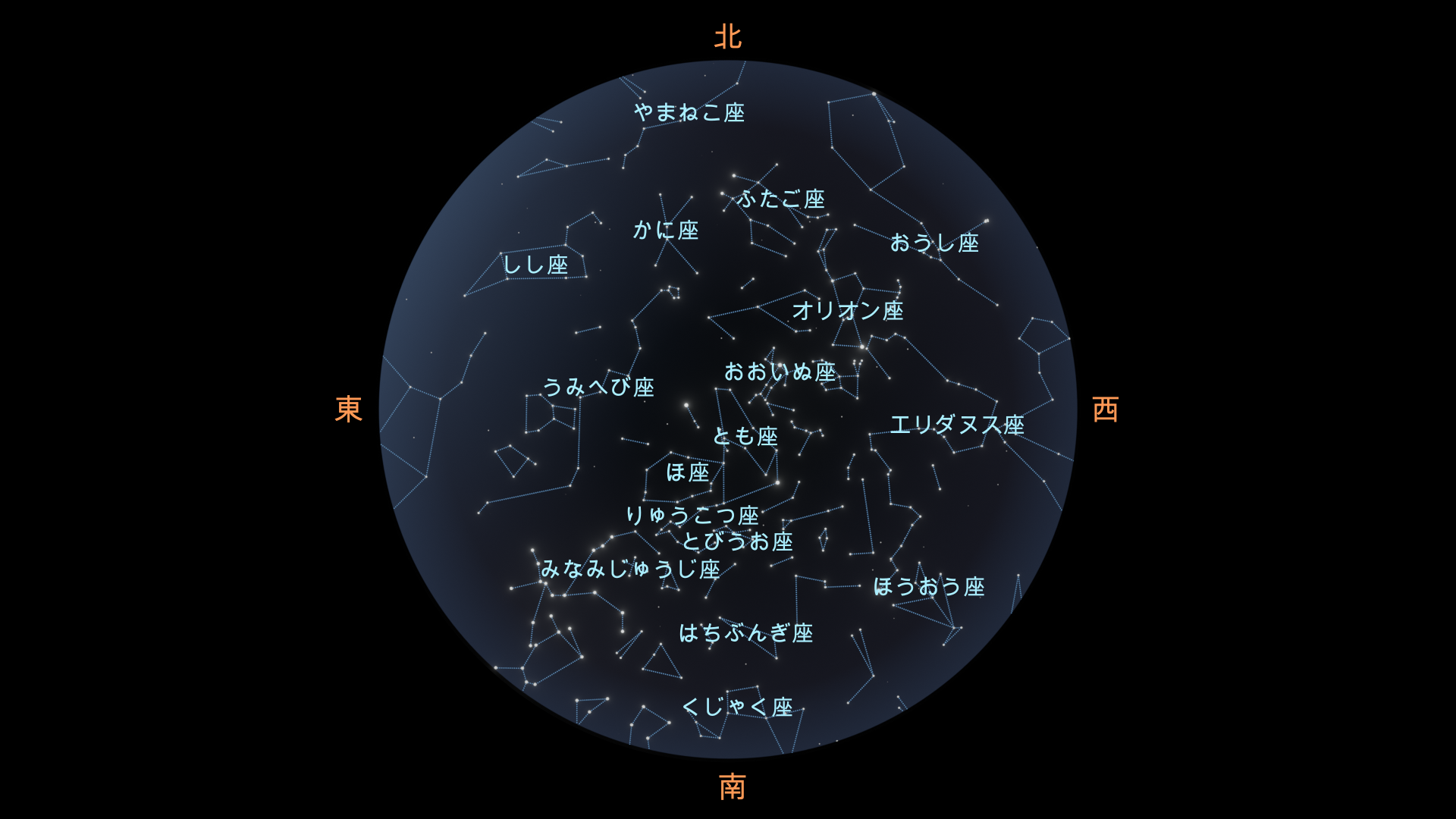 北半球では、こいぬ座やかに座といった冬の定番が夕方の空で見やすく、やまねこ座のような暗い星座も高度が上がって、より見つけやすくなります。