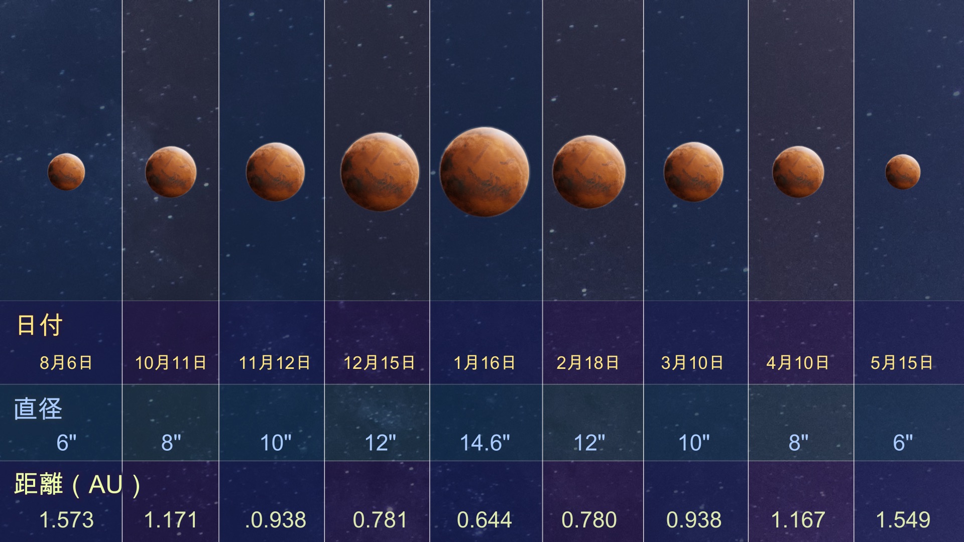 - また、火星は空で最も大きく見える時期でもあります。見かけの大きさは14.6秒角に達し、2024年8月の見かけの大きさの約2.5倍となります。これは、1月12日に火星が地球に最接近(近地点)したばかりだからです。以下の画像で、火星の見かけの大きさが月ごとにどのように変化するかを確認できます。