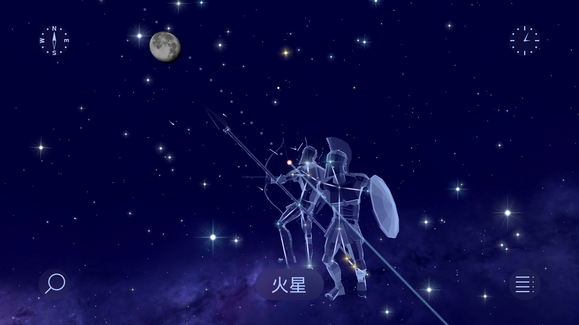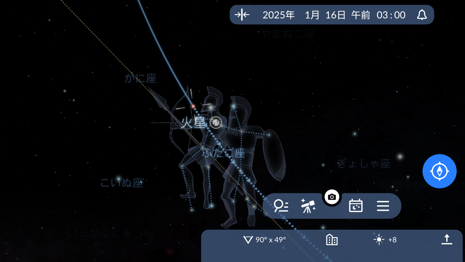 - 青いターゲットのアイコンをタップすると、空に衝の瞬間の火星の位置が表示されます。