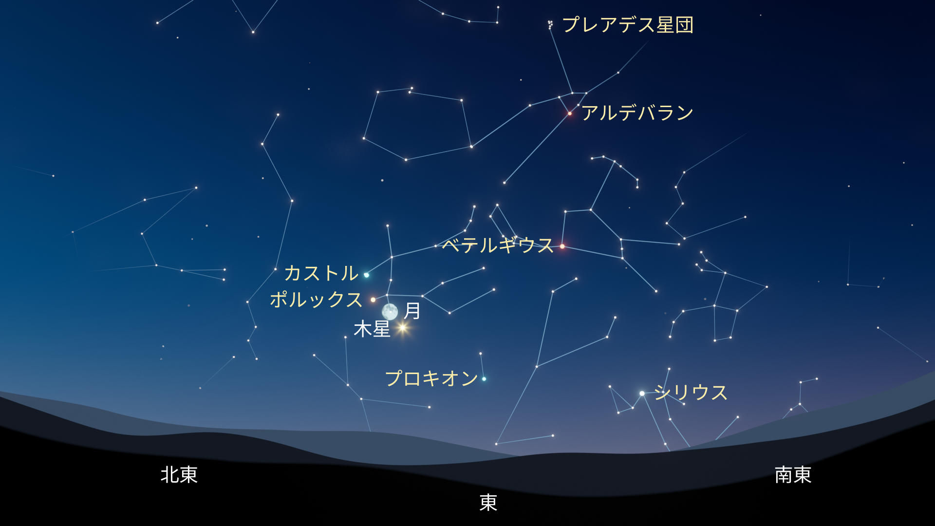 さらに、夜空で最も明るい恒星であるシリウスが、こいぬ座のプロキオンとともに輝き、その間には淡く幻想的ないっかくじゅう座の星々が帯のように広がっています。