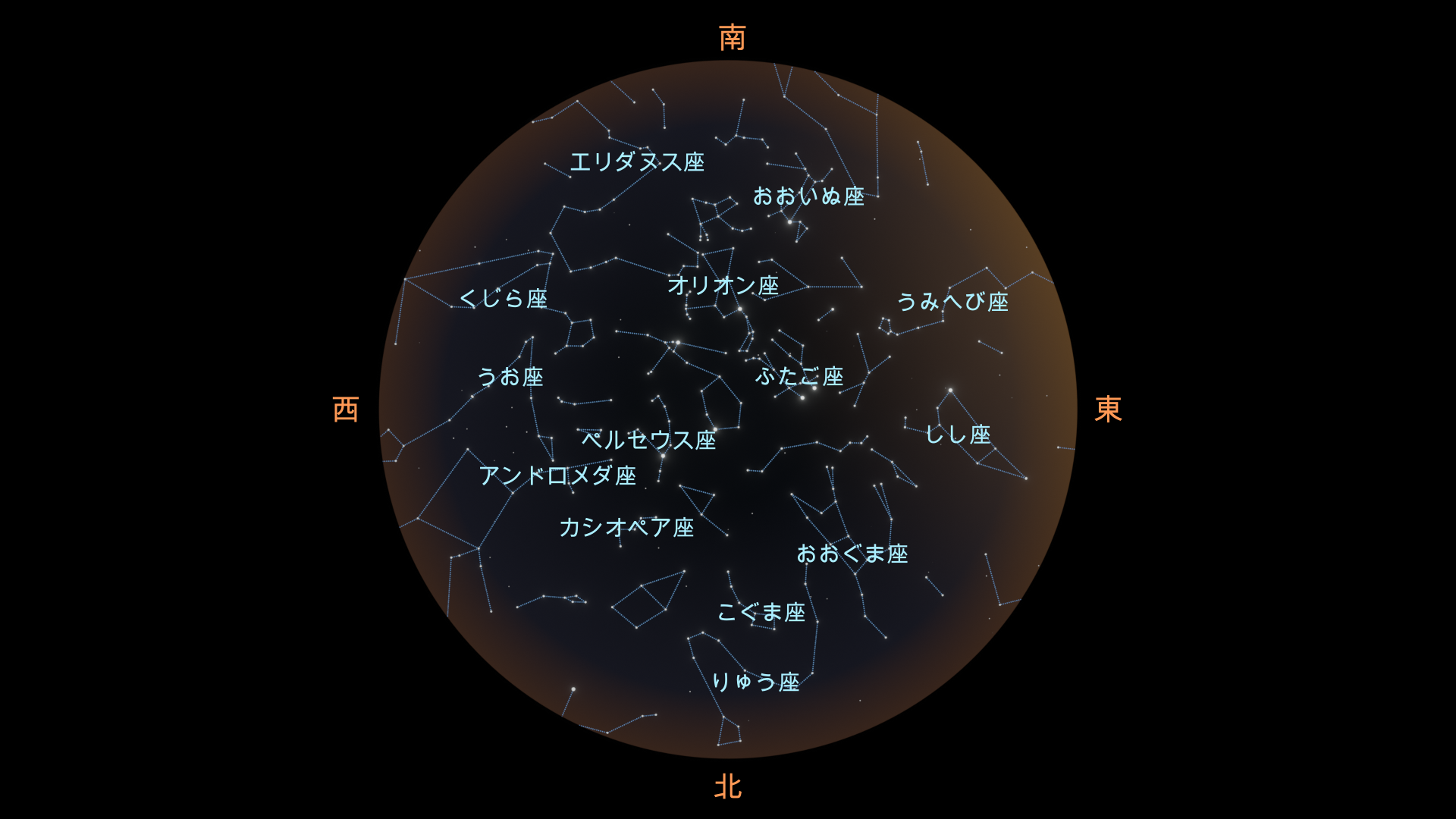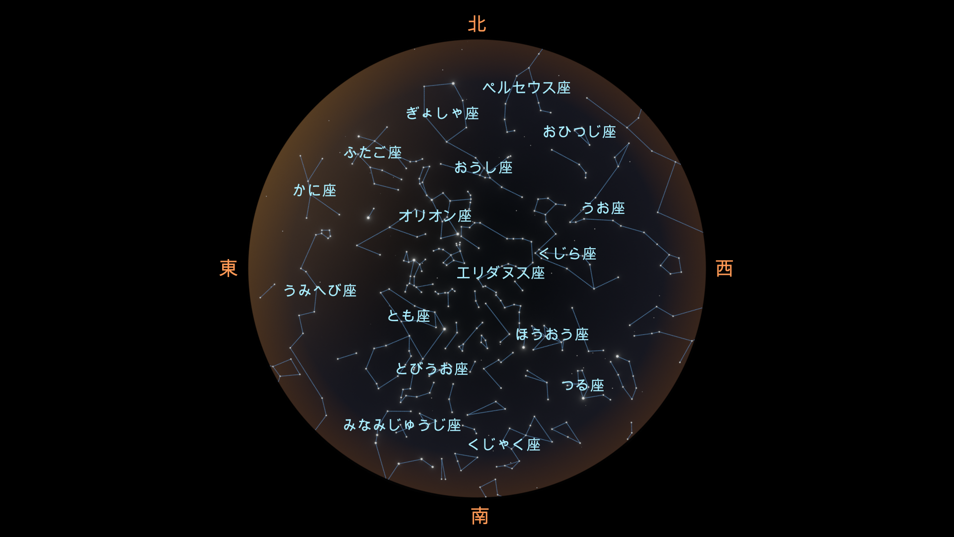 北半球では、12月によく見える星座として、有名なオリオン座、ペルセウス座、おひつじ座、そしておうし座があります。後者2つは黄道十二星座に属しています。