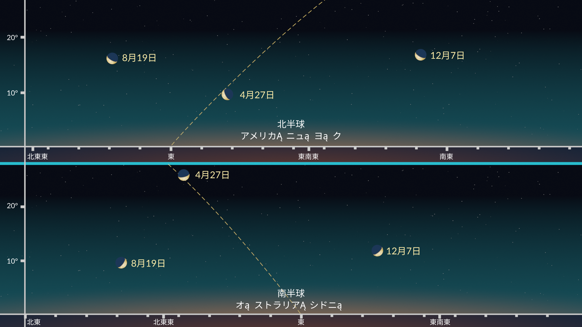 イベントの日付はGMT(グリニッジ標準時)で示しています。実際の時刻はお住まいの地域によって異なります。自分の街での正確な日時を知るには、天文アプリ Sky Tonight を利用してください。