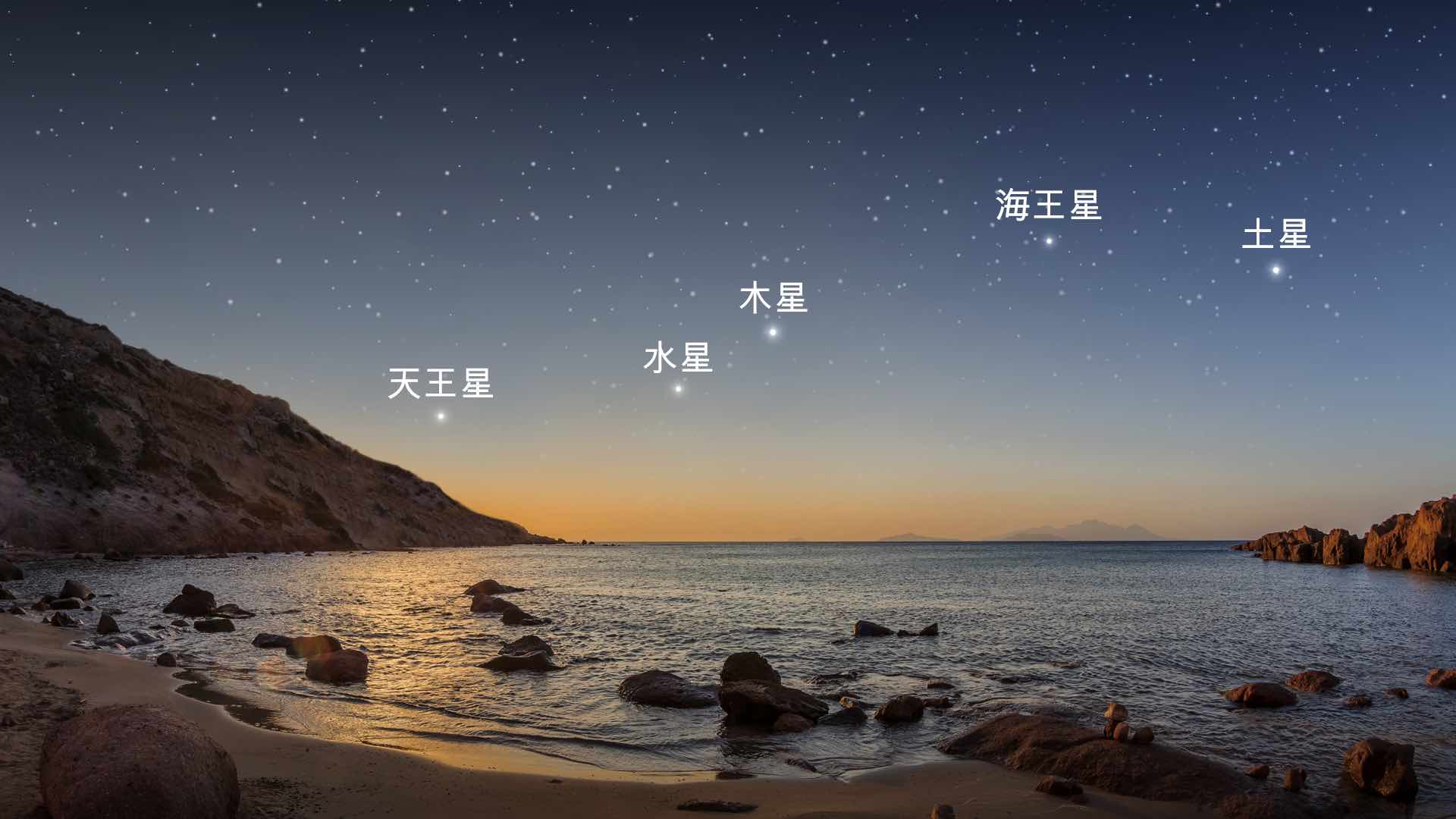 水星(0.8等星)が、月末には朝の空に見えてきます。おひつじ座でそれを探します。夕方には、金星(4.3等星)が西の地平線の上、月初はおうし座、月末はふたご座に見えています。6月の最大離角の途中、月ごとに明るく輝いています。あまり明るくない火星(1.5等級)は、ふたご座の西の空高く、今月末にかに座に移動します。月末にはおひつじ座で東の地平線近くに木星(2.0等星)が見えます。また、土星(0.9等星)が、みずがめ座の南東低空に朝方見えます。海王星(7.9等級)は、朝、うお座の地平線のすぐ上にあるため、望遠鏡を使います。観測時間は1時間程度です。