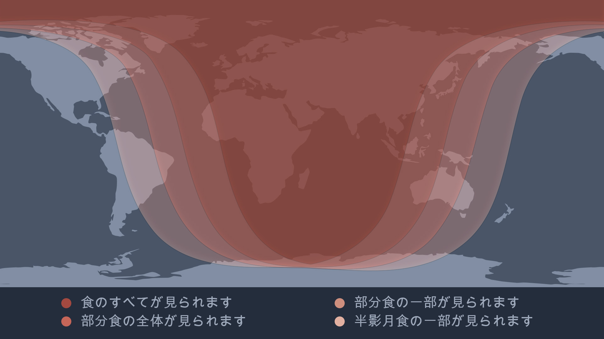 月食の少なくとも一部は、ヨーロッパ、アジア、オーストラリア、アフリカ、北アメリカ、南アメリカの大部分、太平洋、大西洋、インド洋、北極圏、南極大陸のすべてから見えます。