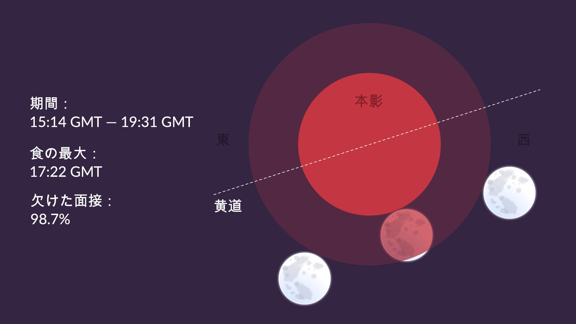 今年の次の月食は、10月28日に起こります。ヨーロッパ、アジア、オーストラリア、アフリカ、北アメリカ、南アメリカの北と東で見られる部分月食となる予定です。定期的に更新されるインフォグラフィックで、次の食を見逃さないようにしましょう!