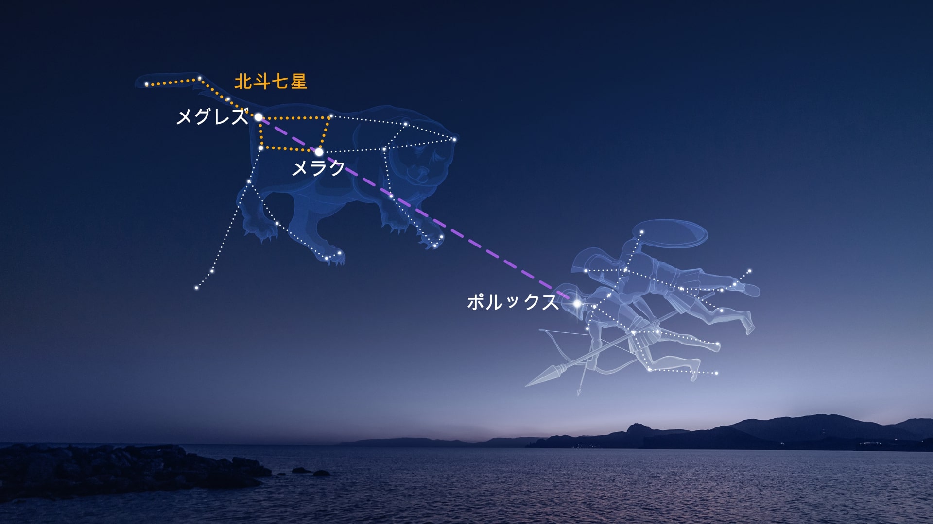 ポルックスを見つける方法の1つは、空で最も目立つ星のパターンの1つである北斗七星を使用することです。北斗七星の「ボウル」と「ハンドル」が交差する星であるメグレスから(そこが北斗七星の「ボウル」と「ハンドル」が交差する場所)星のメラクまでのラインを引き、その後、メグレスから対角線上にある星のメラクから、2つの星が近くに輝いて見えるまでそれに従います。それがポルックスとその「双子の星」カストルです。