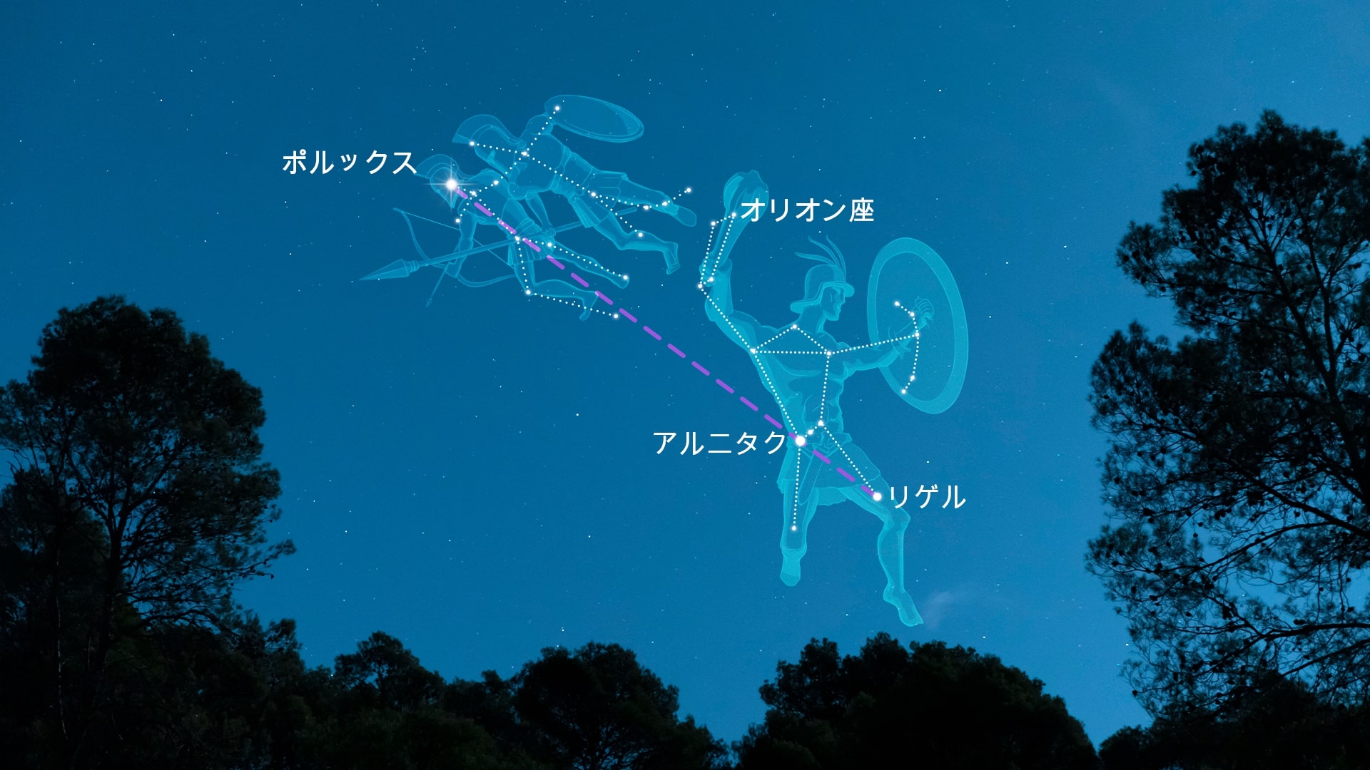 ポルックスを見つける別の方法は、オリオン座の星をガイドとして使用することです。すべきことは、オリオン座の明るい星であるリゲルとアルニタクを見つけるだけで、それらを通る直線を引き、北に延ばすことです。