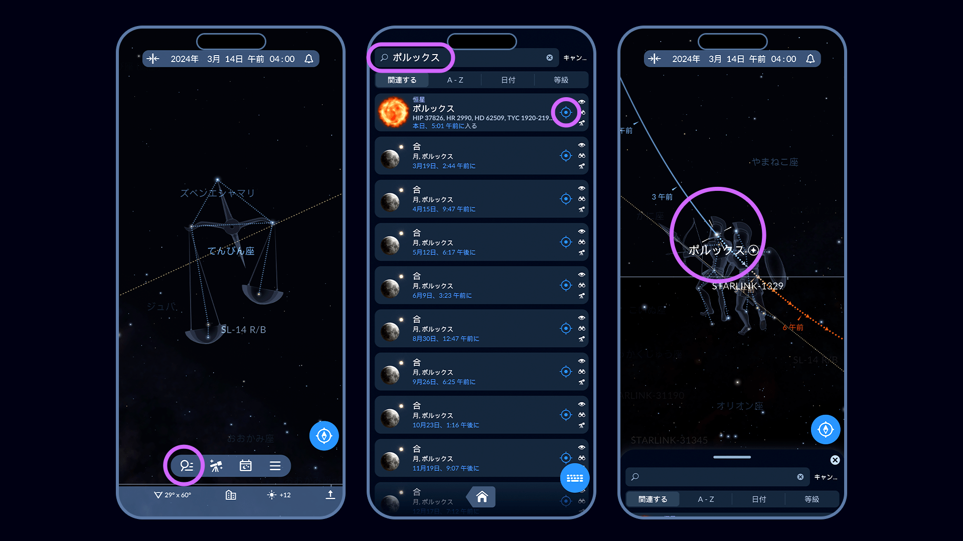 ポルックスを見つけるもう一つの方法は、Sky Tonightのような星空観察アプリを使用することです。このアプリを使用すれば、わずか数タップで星の位置を確認できます。以下の画像を見て、またはビデオガイドに従って、それがどれほど簡単かを確認してください!