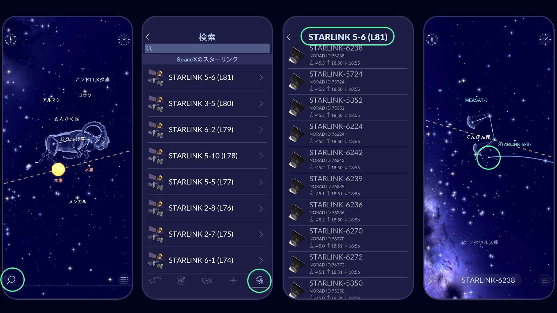 Star Walk 2でStarlinkを探すには、虫眼鏡アイコンをタップします。次に、検索パネル下部のバーにある衛星アイコンをタップします。最近打ち上げられたStarlinkは「Main Satellites」リストの上部に表示されます。特定のミッションを追跡したい場合は、「SpaceX’s Starlink」セクションまでスクロールし、ミッション名をタップして衛星リストを開きます。衛星をタップすると、その位置や軌道に関する正確な情報が表示されます。