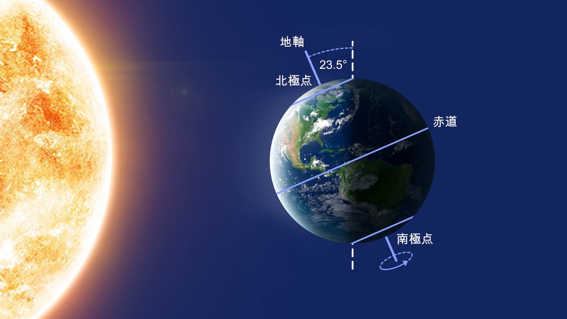 この軸は地球の公転面に垂直ではなく、約23.5°傾いています。そのため、1年を通して、北極と南極は異なる角度で太陽に向かって傾いています。これをイメージしにくい場合は、動画を見てください。
