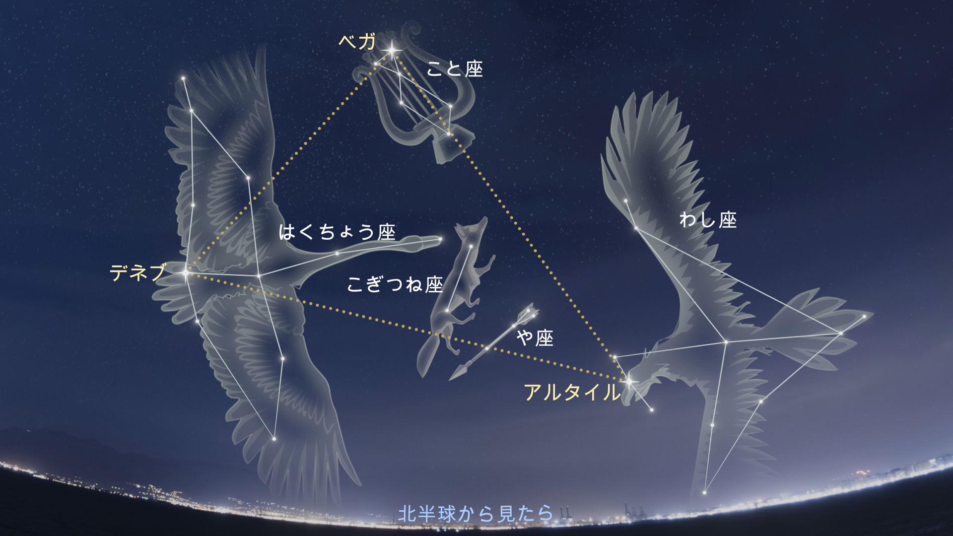 夏の大三角は「アステリズム¹」と呼ばれる目立つ星の集まりです。北半球のほとんどの地域では年間を通して見えますが、はっきり見える最適な時期は夏の数か月間で、その間に夜空の高い位置に昇ります。その明るさと見やすさから、最も人気のある星のパターンのひとつとなっています。