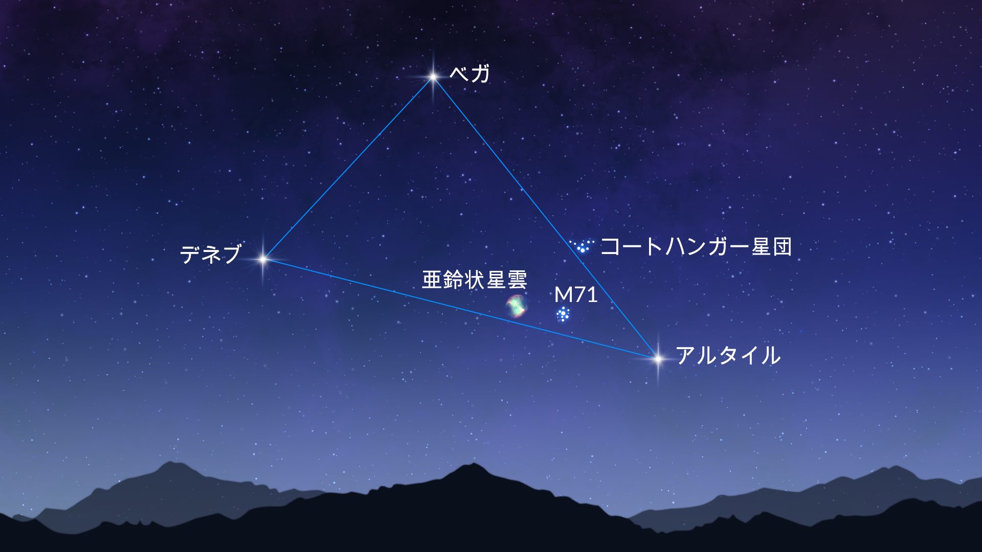 夏の大三角をマスターしたら、さらに観察を進めて、その中にあるより難しい天体を探すことができます。双眼鏡を使って、ベガとアルタイルのほぼ中間を見ると、コートハンガー(英語:Coathanger)と呼ばれる散開星団があります。コートハンガーの主要部分は6つの星で構成され、「フック」はさらに4つの星で構成されます。この星団は、ブロッキ星団、アル・スーフィー星団、またはコリンダー399とも呼ばれます。