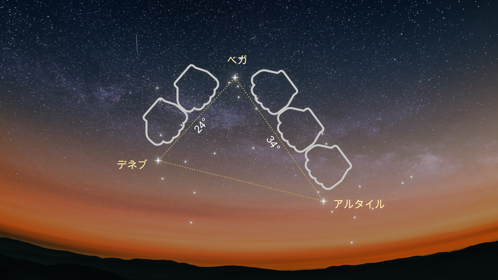 夏の夜、北半球では夏の夜空のほぼ天頂付近に、南半球では冬の夜空に輝く有名なアステリズム(星群)が「夏の大三角」です。これは、3つの異なる星座に属する明るい星デネブ、ベガ、アルタイルによって形作られており、また2つの小さな星座を横切っています。夏の大三角は巨大で、ベガからアルタイルまでの距離は約34度、夜空の約5分の1に相当します。この見つけやすい星の並びを探す最も簡単な方法は、Sky Tonightアプリを使うことです。