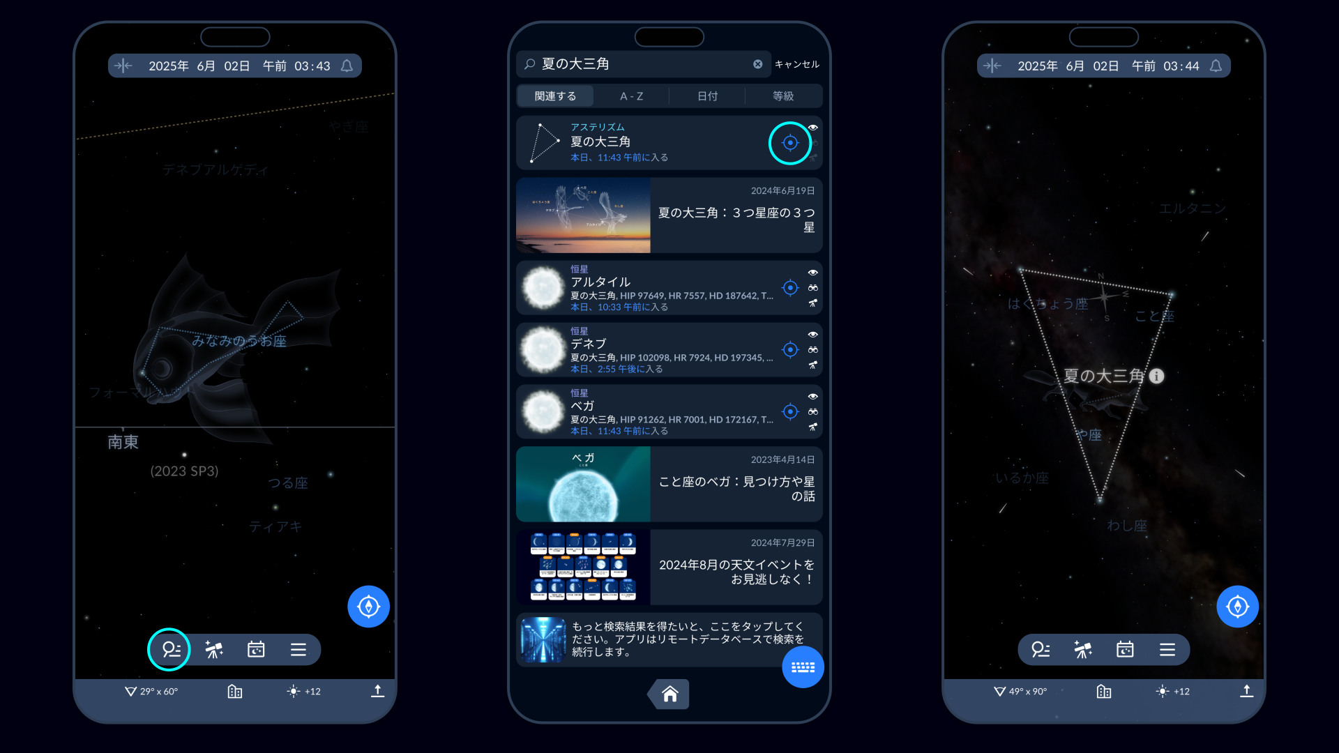 この3つの点を結ぶと、夏の大三角形になります。正しく確認するには、Sky Tonightアプリを開き、検索ウィンドウに移動します。検索バーに「夏の大三角」と入力し、該当する結果が表示されたら、その横にある青いターゲットアイコンをタップしてください。アプリは、夏の大三角形があなたの位置の空のどこにあるかを表示します。デバイスを空に向けると、アプリはリアルタイムの星図も表示し、デバイスの動きを追跡します。
