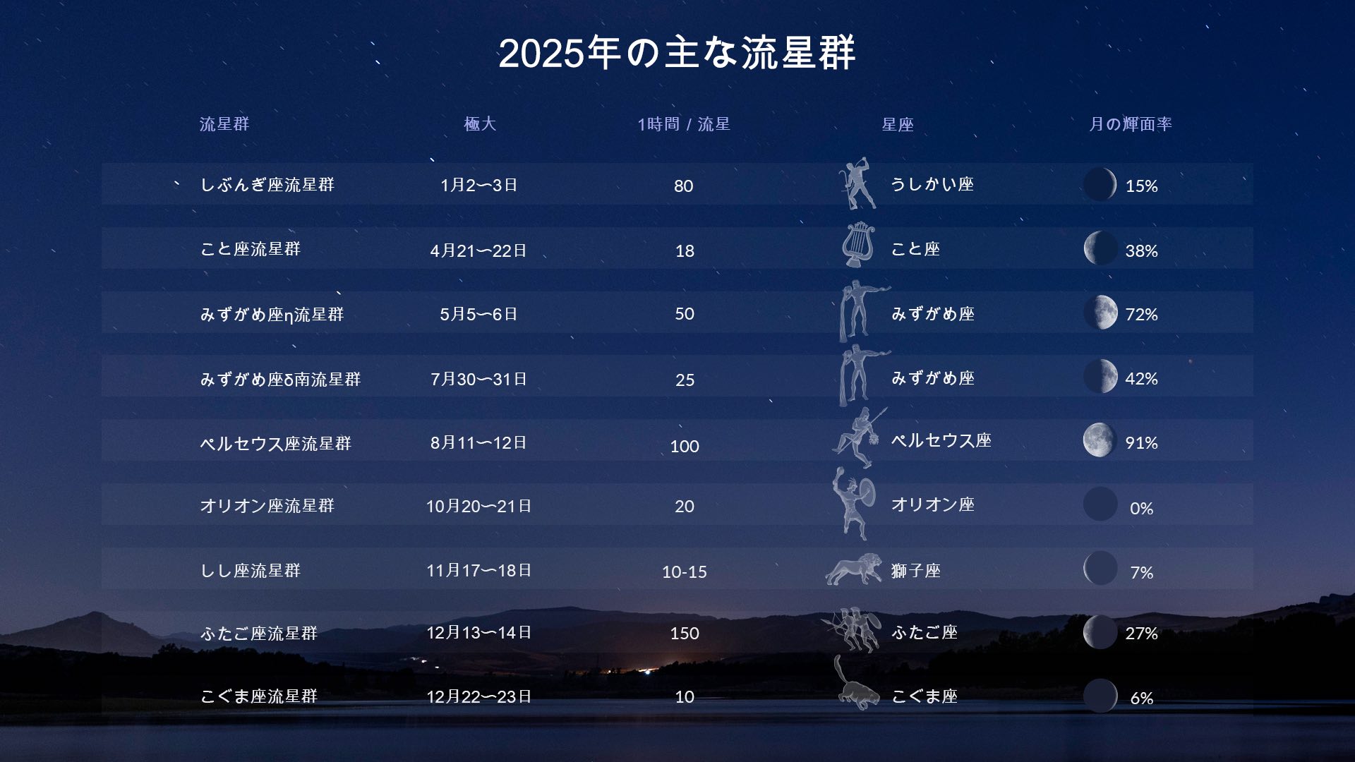 これは、2025年の活動期間を含む最も著名な流星群のリストです。これらの各流星群は、毎年ほぼ同時に出現します。リンクをクリックして、それぞれの詳細をご覧ください。