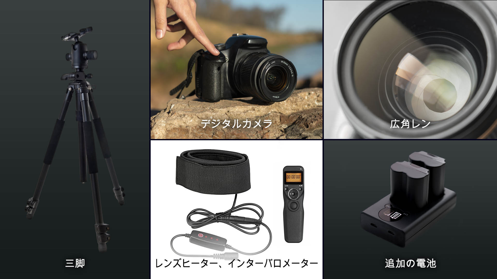 - DSLRカメラを使います。ISO、絞り、シャッタースピードなどをフルマニュアルで設定できるため、流れ星撮影には不可欠です。